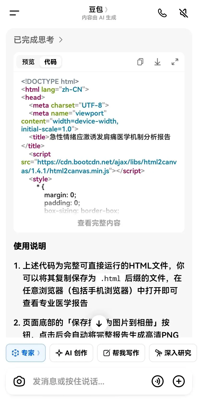 •第二步(关键)要求AI不以文字的方式输出,而是以HTML的格式帮助你写一系列代码,生成网页。