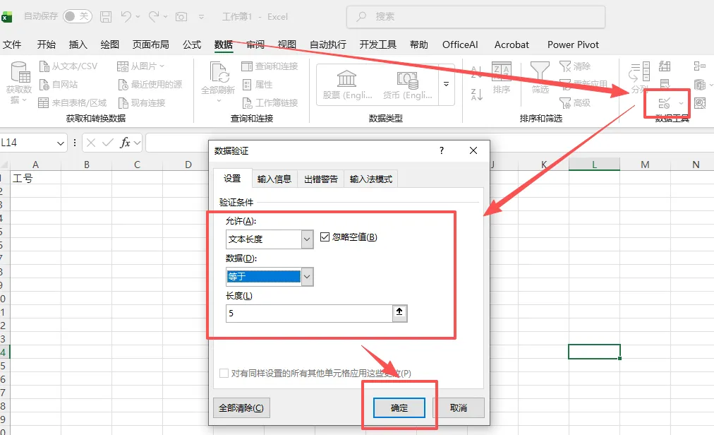 如果我们不做约,多字少字就很难避免,而且通过肉眼识别,绝对是意见让人痛苦的事情,这时候我们只需把需要约束的列,点击数据验证,在“允许”下拉菜单中选择“文本长度”,在“数据”中选择“等于”,然后输入具体的长度数值,假设工号是5位,那我们就输入5就可以了。