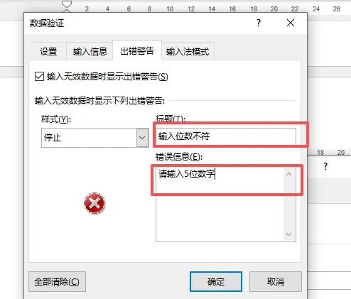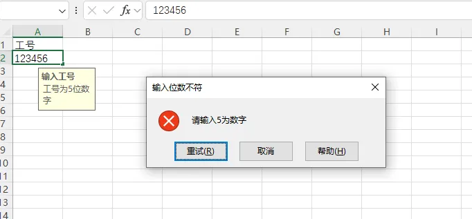 设置完成后,如果有伙伴未按照要求输入,Excel会立刻弹出警告框,拒绝录入。并告知出错原因,比如我输入6位数字后,我们看下结果。