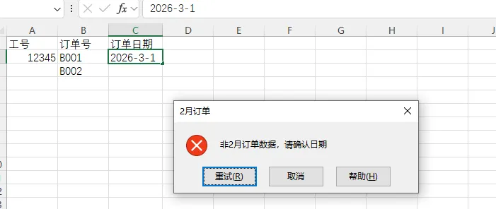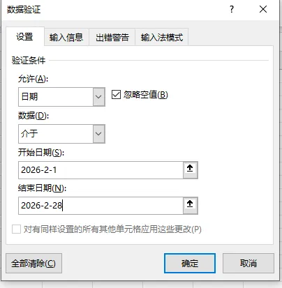 比如我要求的是26年2月份的订单,不允许其他期间的订单,我们可以设定时间范围,比如下面的设置
