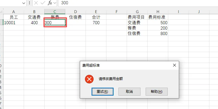 我们先做一个费用标准的对照表,选中B2:D2单元格,点击数据验证,验证条件为自定义,公式输入=B2<=VLOOKUP(B1,$G$2:$H$4,2,FALSE),我们再B2输入400时,标准未超,不提示,但在C2单元格输入300是提示费用超标准,这样我们就能按照标准来自动约束了。