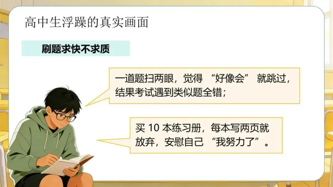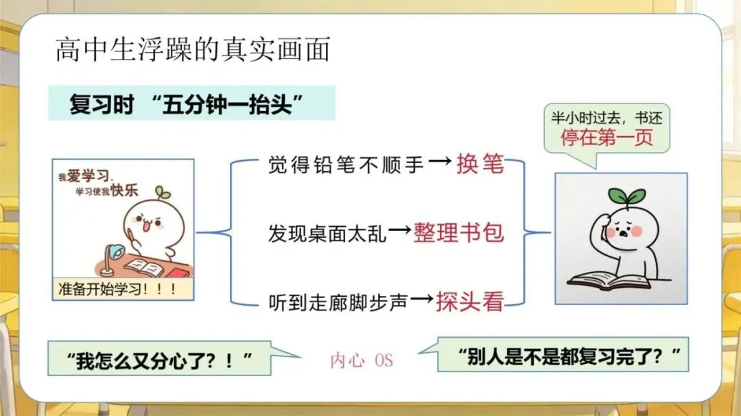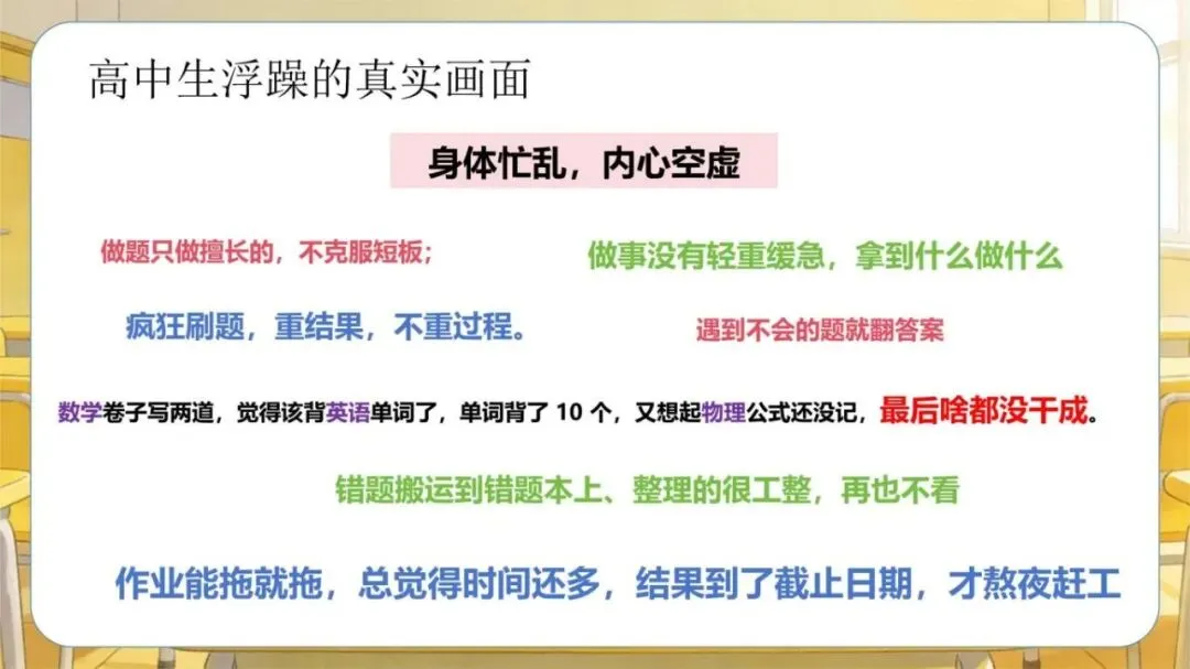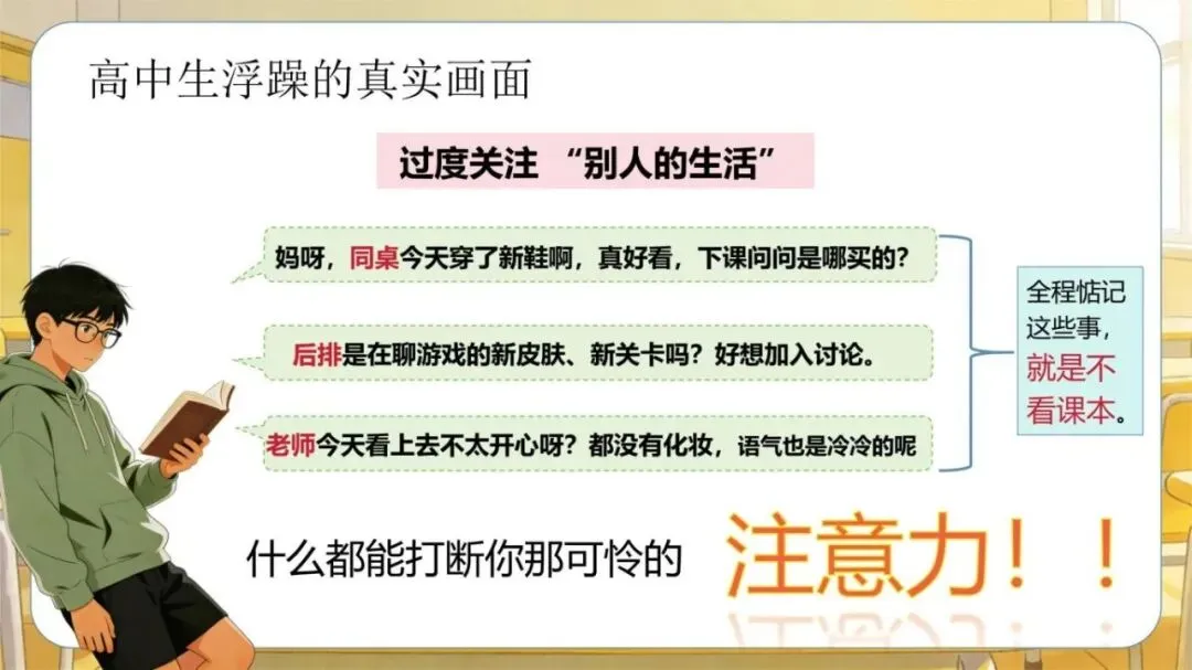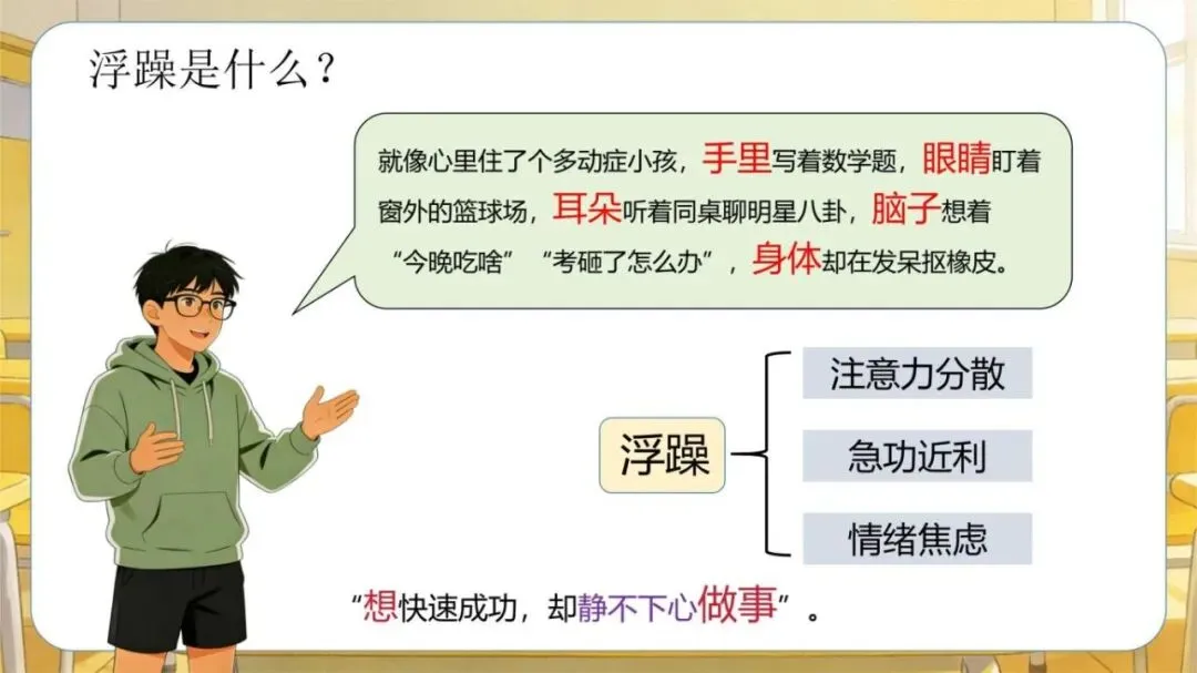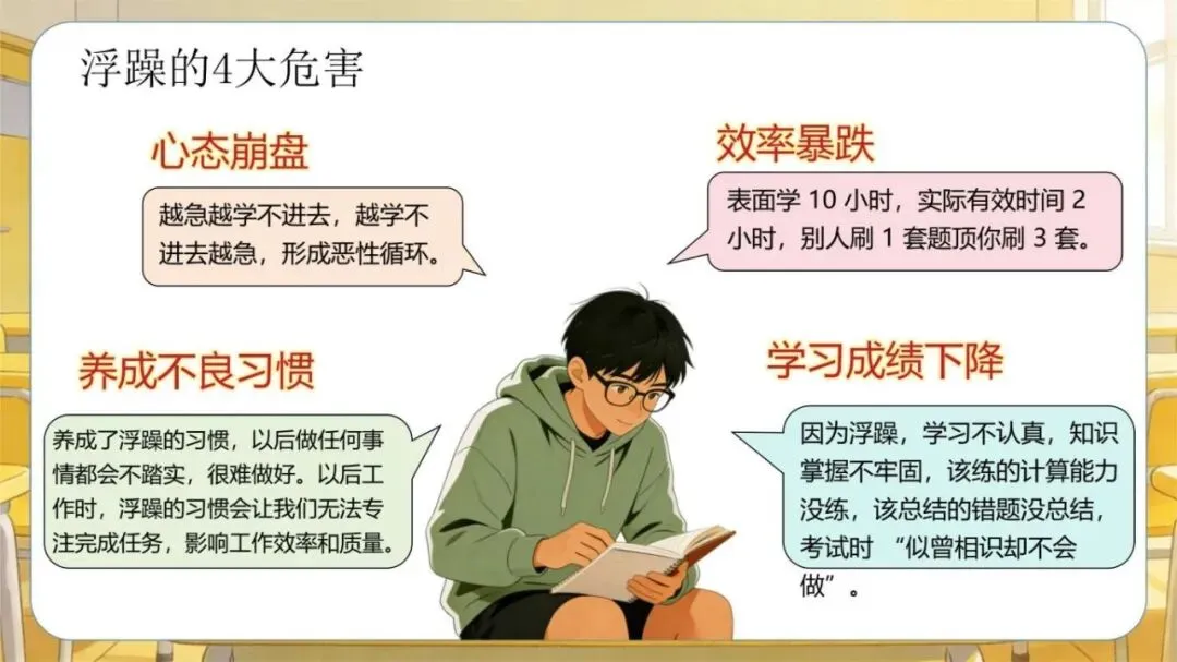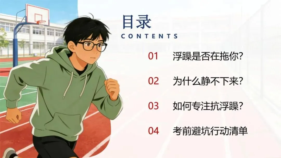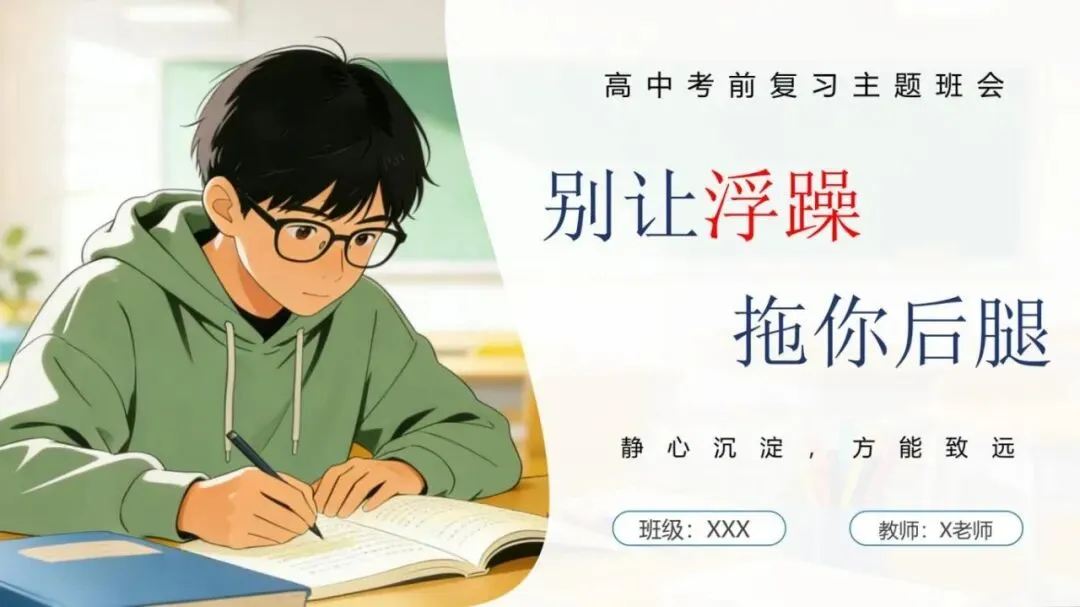 1、模板名称:《【高中】考前复习指导主题班会:别让浮躁拖你后腿》PPT(含逐字稿+教案)(30页);
