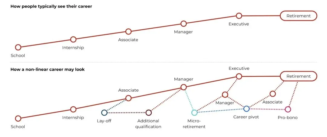 随着我们的人均寿命延长和职业周期拉长(可能工作到70+哦),传统的”工作40年然后退休”的模式正在消亡。微退休(Micro-retirements)将成为新常态——在职业生涯中(最好是)主动按下暂停键,用于学习、休整或探索新方向。(先声明: 这词儿不是我发明的。)
