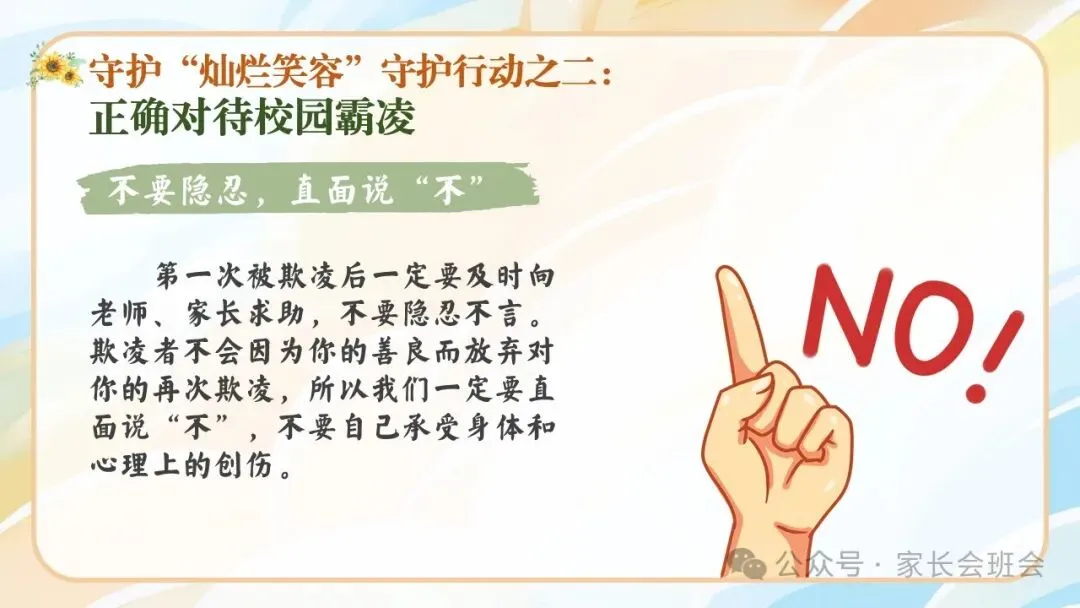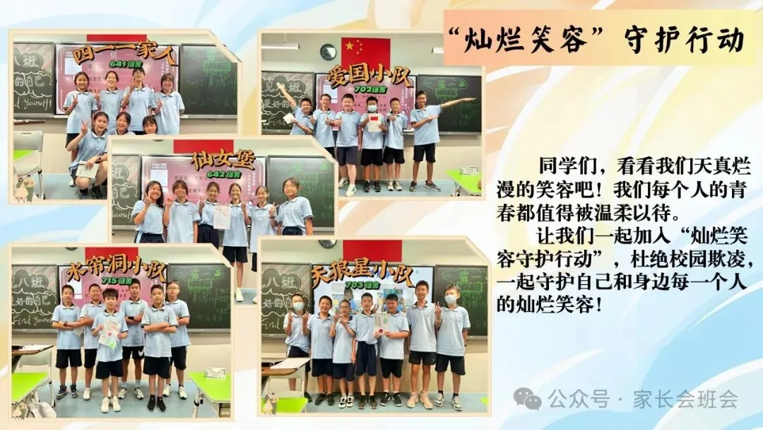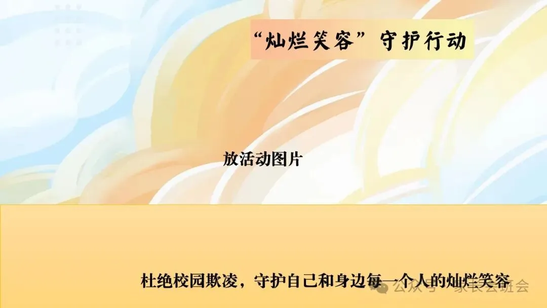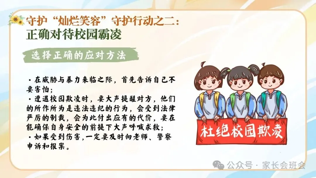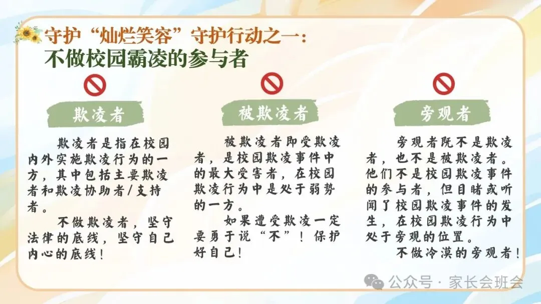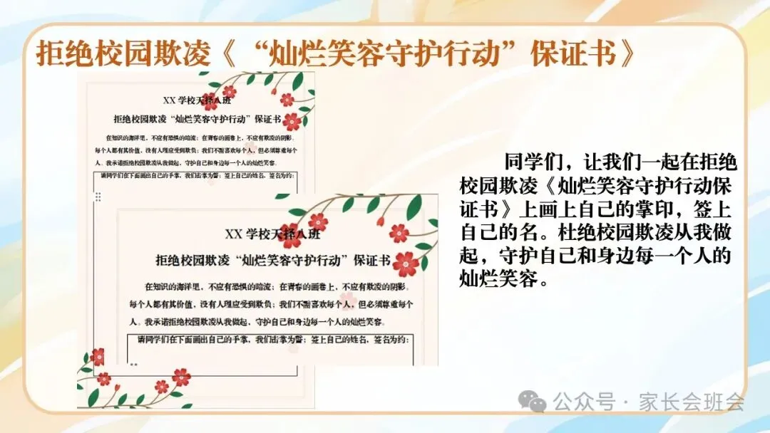 >杜绝校园霸凌、欺凌班会ppt:“灿烂笑容”守护行动.含讲稿、视频、保证书
