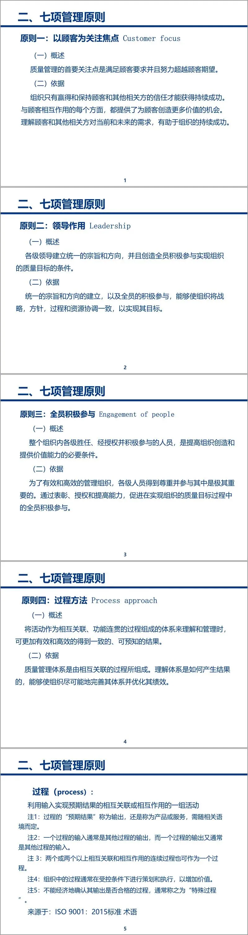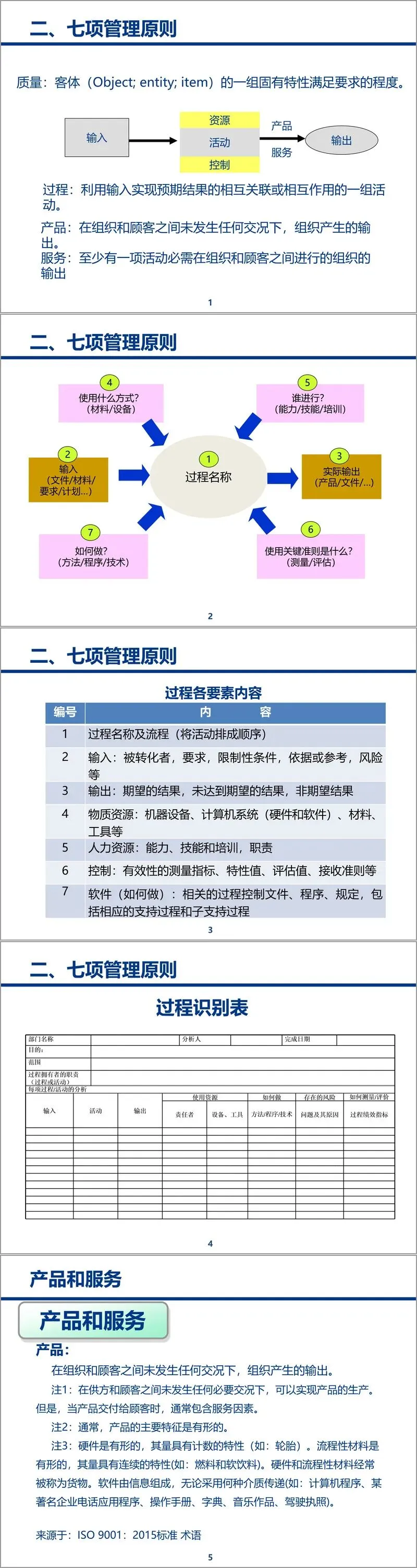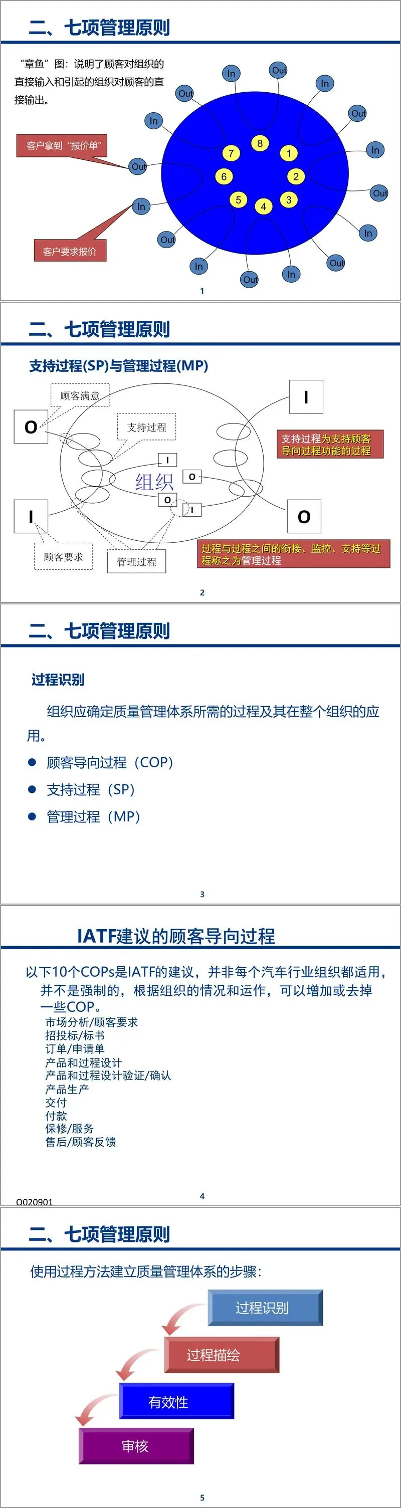 讲义对每一项管理原则都进行了深入剖析。特别是对“过程方法”进行了重点阐述,详细定义了过程的输入、活动、输出及控制方法,并引入了汽车行业广泛使用的“顾客导向过程(COP)”、“支持过程(SP)”和“管理过程(MP)”概念。通过“章鱼图”和过程流程图等工具,生动说明了如何识别和管理这些过程及其相互作用,以确保质量管理体系的有效性和效率。讲义还强调了过程绩效指标的重要性,并列举了不同职能领域的衡量指标示例。