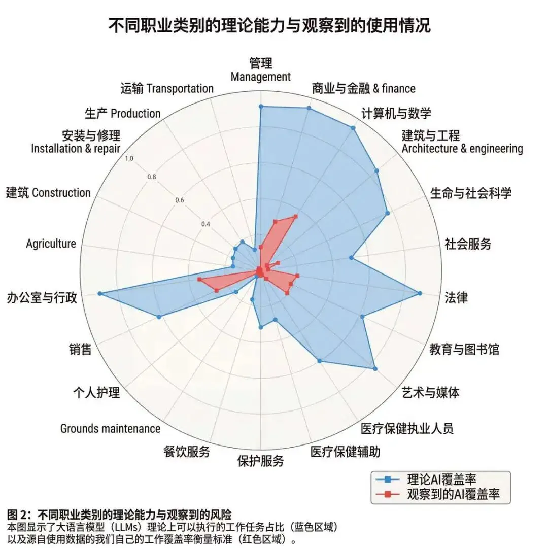 我们先来看图表的右半边。图中蓝色的面积,代表了大语言模型(LLM)理论上能替代的工作量。