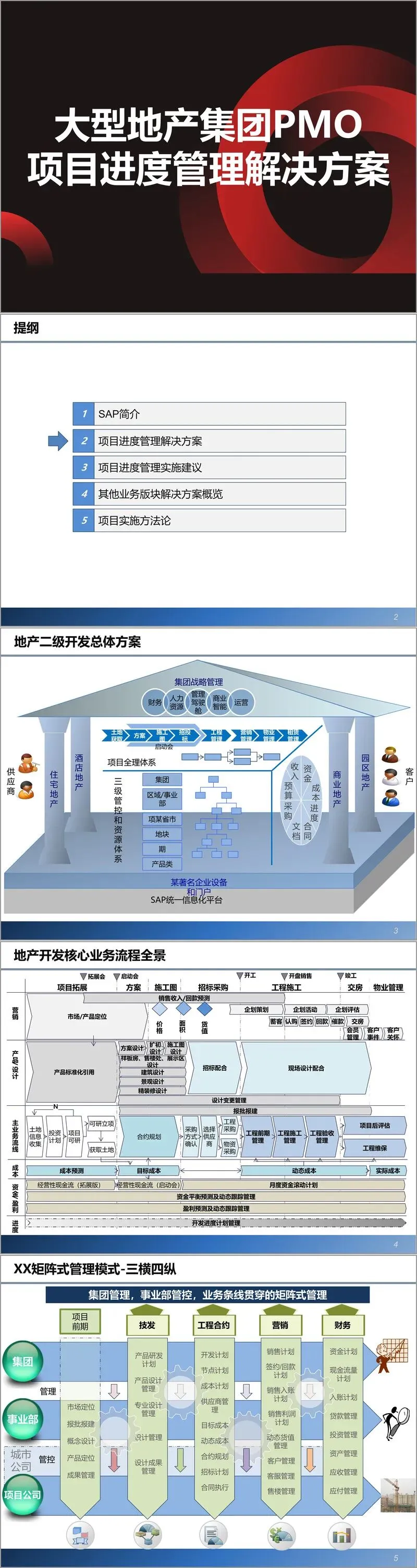 这份文件系统性地阐述了一套以SAP系统为核心平台,为大型地产集团构建项目进度管理体系的完整解决方案。该方案并非孤立地看待进度管理,而是将其视为贯穿项目开发全生命周期的核心主轴,通过“小进度”、“中进度”、“大进度”三个层次,由微观到宏观,实现了从具体任务执行到集团战略管控的全面覆盖与深度融合。