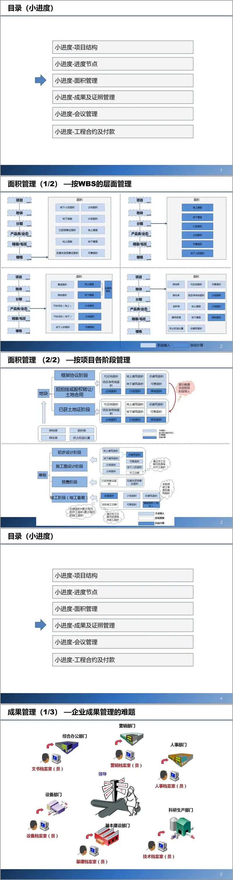 方案的核心框架是“时间进度为主轴的项目全生命周期管理”。在这一框架下,“小进度”聚焦于项目开发现场的精细化管理。它以项目结构(WBS)为基础,定义了从集团到项目公司各层级关注的进度节点模板,实现了进度计划的标准化与分级管控。方案特别强调了面积管理、成果及证照管理与进度节点的强关联,确保关键成果和证照的获取与项目推进同步受控。会议管理系统则被设计为项目决策和执行的协调中枢,通过与进度计划的联动,自动触发会议安排、材料准备和决策事项跟进,提升了管理效率。此外,工程合约及付款管理与进度节点的紧密集成,使得合同执行、请款付款与工程形象进度实时匹配,为成本与资金控制提供了精准依据。