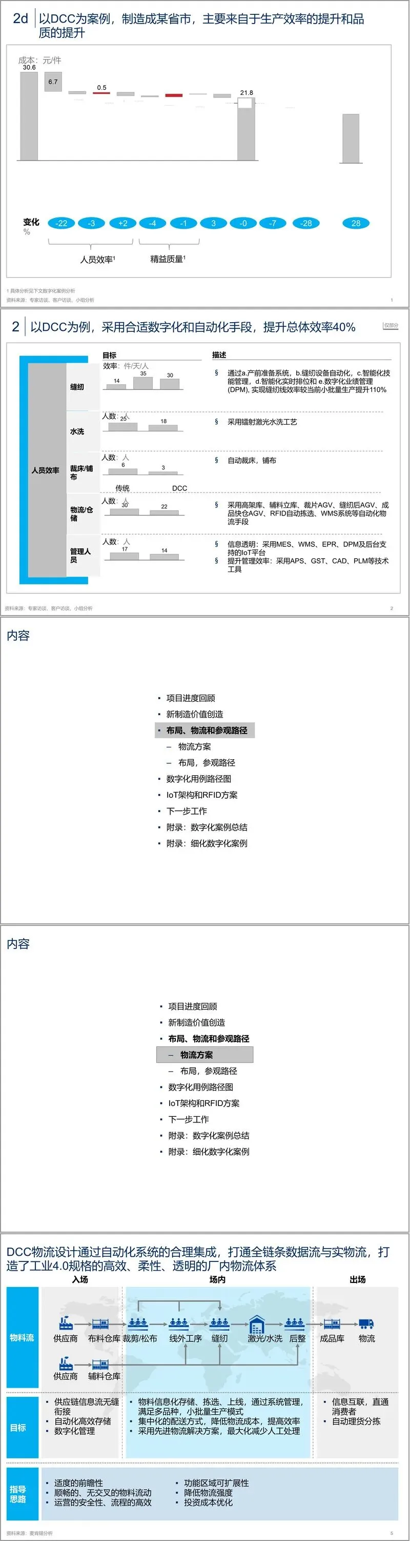 数字化用例的实施路径图是项目的核心引擎。方案围绕“按需生产”、“人员效率”、“精益质量”和“数据智能”四大技术价值,规划了短期、中期和长期的落地举措。例如,通过智能排产系统优化订单排程,利用电子化产前准备和实时线平衡工具提升换线效率,应用镭射雕刻等技术提升质量并实现环保生产。这些用例将共同作用,目标是将交货期从传统的30天大幅缩短至7天,甚至挑战更短周期。