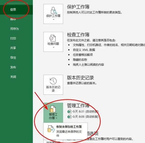 如果不小心你的文件未保存,就被关闭了,可通过文件 - 信息 - 管理工作簿 - 恢复未保存的工作簿,来解决该问题。