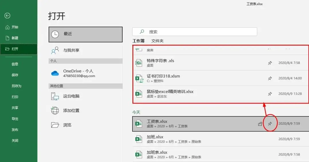 如果一个Excel文件不经常使用,但是隔一段时间会用到。此时可将其置顶起来,用到时,依次点击文件 - 打开,即可快速找到它。