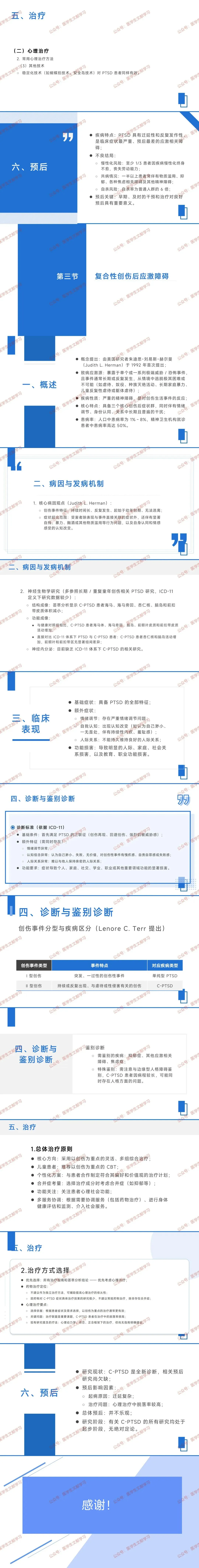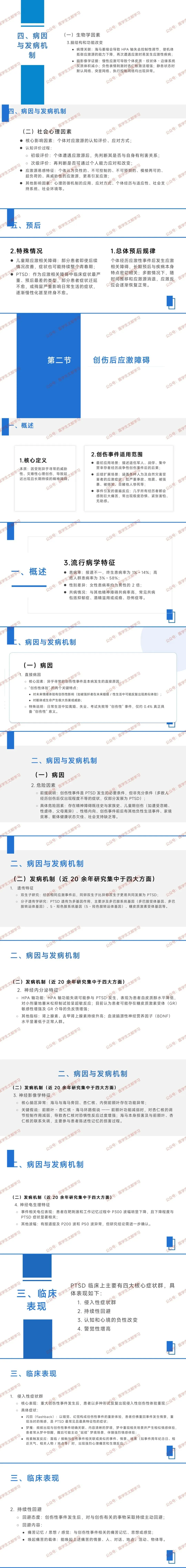 病因:直接病因是异乎寻常的创伤性事件(需对未来情绪有创伤性影响、威胁躯体 / 生命,日常 “创伤” 仅 0.4% 具真正 “创伤性”);危险因素包括精神障碍史、童年创伤、性格内向、社会支持缺乏等(创伤事件是必要非充分条件)。