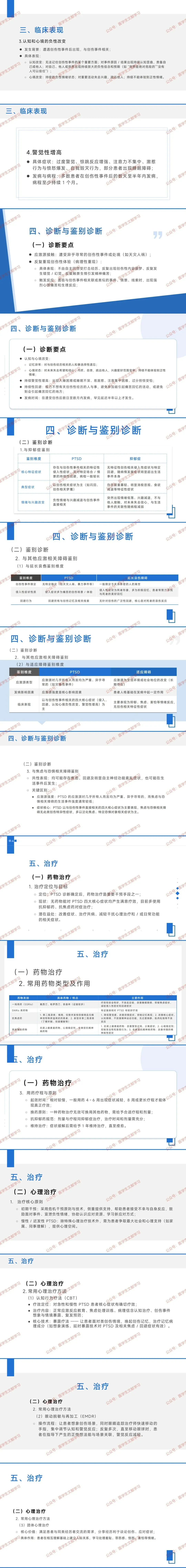 鉴别:与抑郁症(PTSD 有创伤相关症状,抑郁无且有晨重暮轻);与延长哀伤障碍(PTSD 无事件限定,侵入症状为痛苦场景,延长哀伤限定亲密者离世,侵入症状多积极回忆);与适应障碍(PTSD 应激源更严重,症状具创伤特异性);与焦虑恐惧障碍(PTSD 应激源更重,症状与创伤直接相关)。