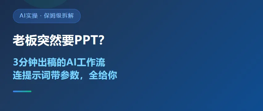 点亮「赞+在看」,公众号后台回复关键词「PPT提示词」,获取本文的两套完整提示词文本 + Gamma参数速查表PDF,直接下载收藏。这套流程用在不同行业、不同汇报场景里,细节参数会有差别。遇到跑出来的效果不对、或者不知道怎么改的,扫码加微信([微信号]),拉你进AI实战破局群,把你的截图丢进来,当天帮你调。你平时做PPT最卡在哪一步——是找不到灵感、数据图表不会做、还是排版总觉得丑?评论区聊聊,票数最高的痛点,下期直接做专项拆解。#PPT制作技巧#AI职场实操#Gamma工具#干货分享#职场效率