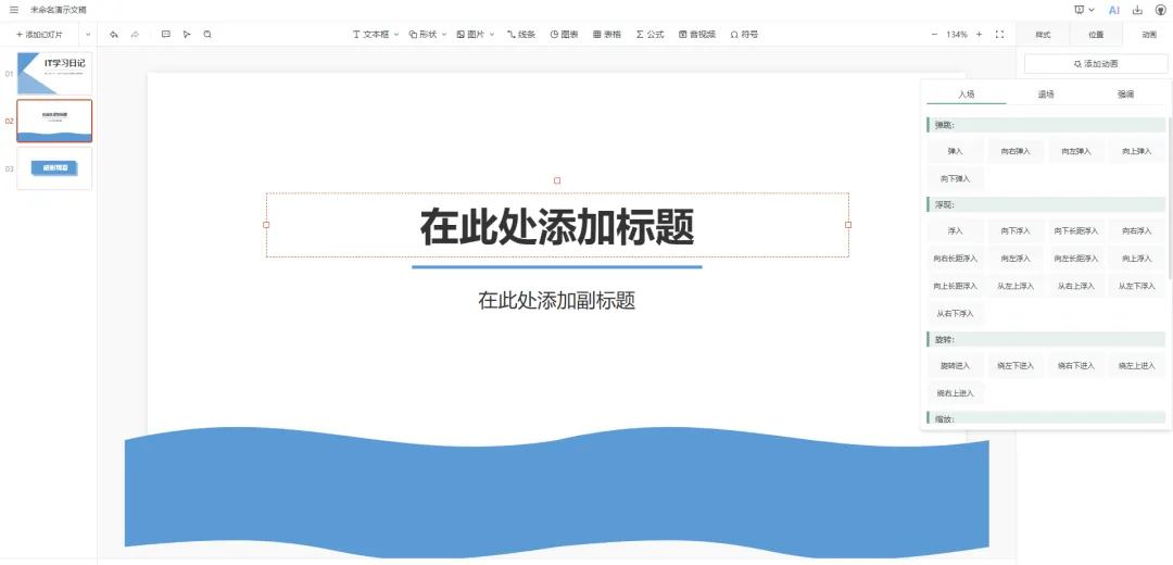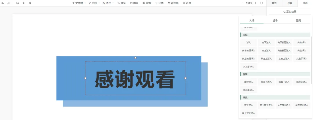 支持元素的入场、强调、退场动画,以及路径动画(自定义运动轨迹)等动态效果使用