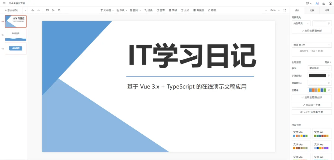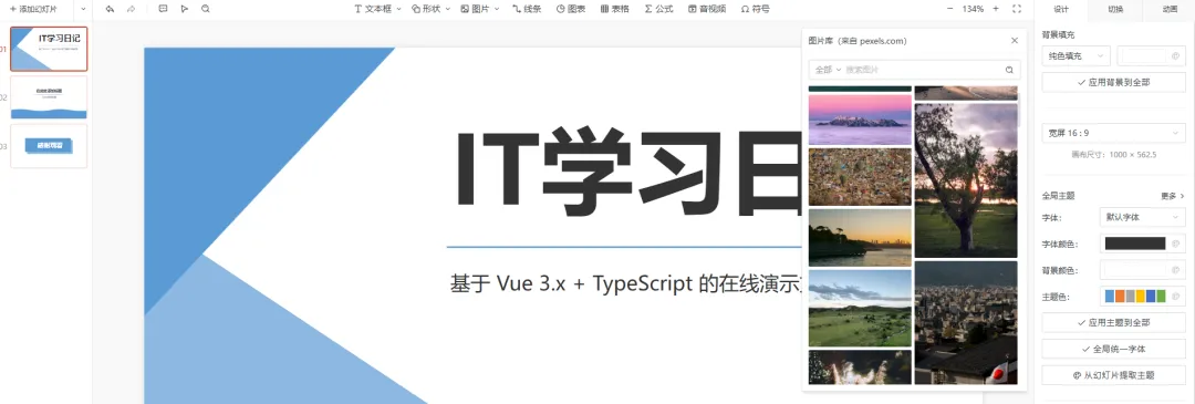 本项目是一款开源的在线演示文稿(PPT)制作系统,基于它,无需安装软件,即可在Web端快速制作出各类风格的PPT。系统采用了类似PPT的非线性编辑模式,支持文字、图片、形状、线条、图表、表格、视频、音频、公式等最常用的元素类型和自由排版、多格式导出、在线预览、AI生成等核心功能。