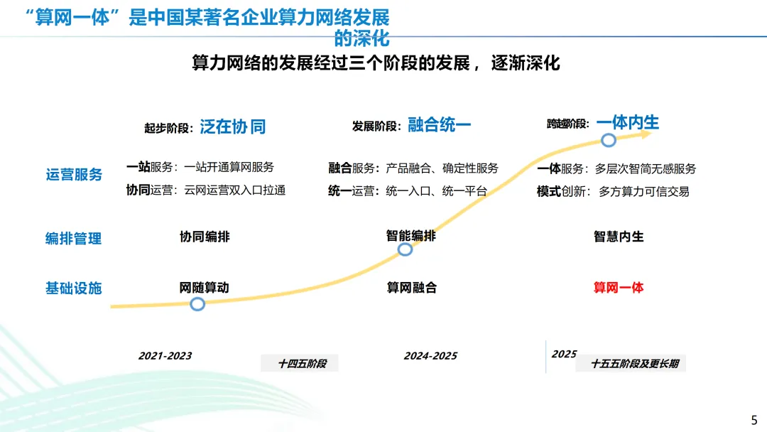 需要明确的是,算网一体与算力网络既紧密相关又有所区别:算力网络是由计算设施与网络设施共同构建的传输载体,而算网一体则是建设这一载体想要实现的最终目标,是算力网络发展的高级阶段。当前,我国算网建设正处于算网协同与算网融合并行推进的阶段,逐步向算网一体的终极目标迈进。