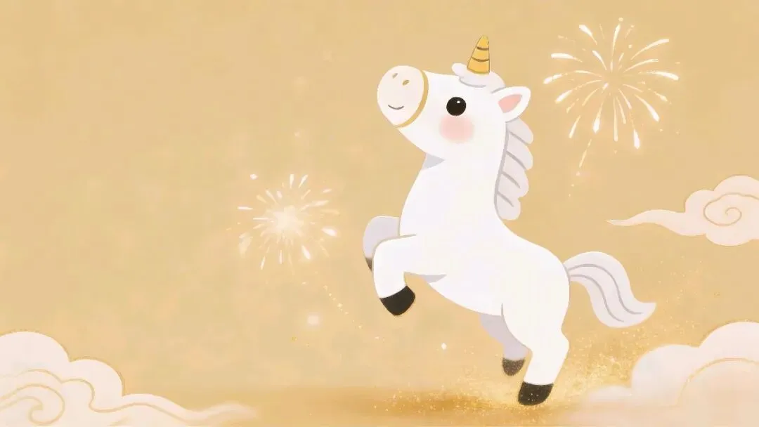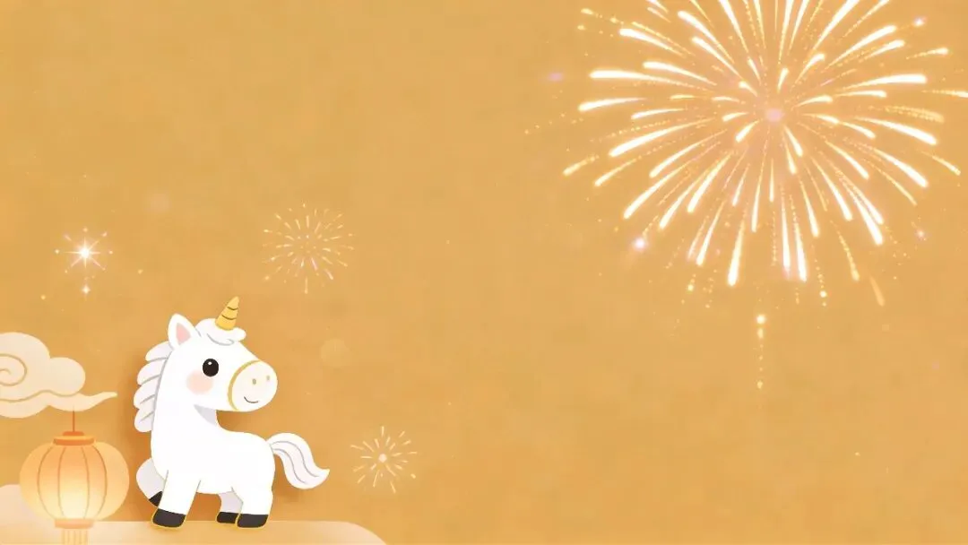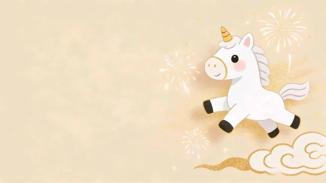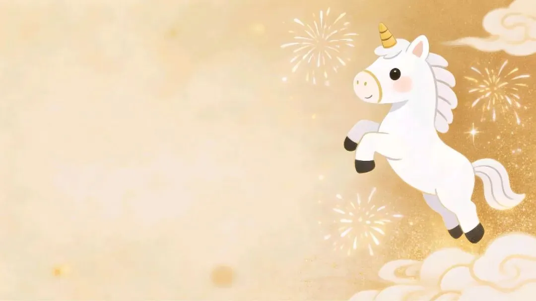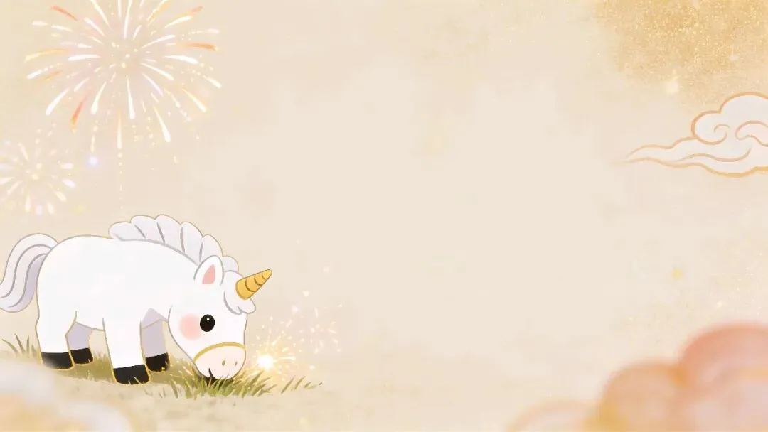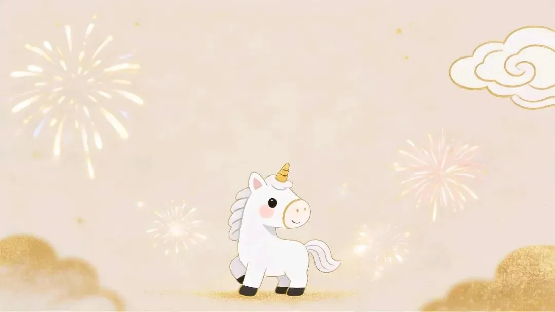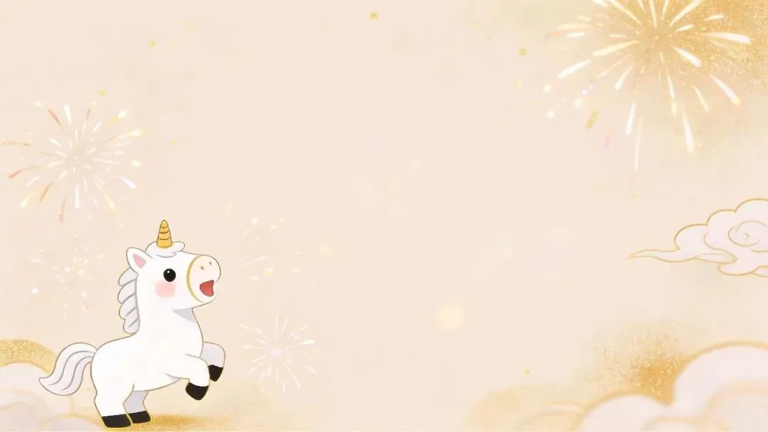 这组图片以浅米/暖金底色为基底,搭配可爱的卡通独角兽(马年形象)、鎏金烟花、祥云、灯笼等元素,营造出活泼又喜庆的新年氛围。