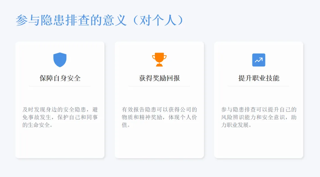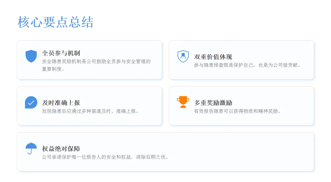 《安全隐患奖励机制新员工培训》,用通俗易懂的语言、生动鲜活的案例,为大家详细讲解这一机制的运行规则、奖励内容及申报流程。让您快速了解如何通过发现、上报安全隐患,为企业安全贡献力量,同时收获属于自己的奖励。
