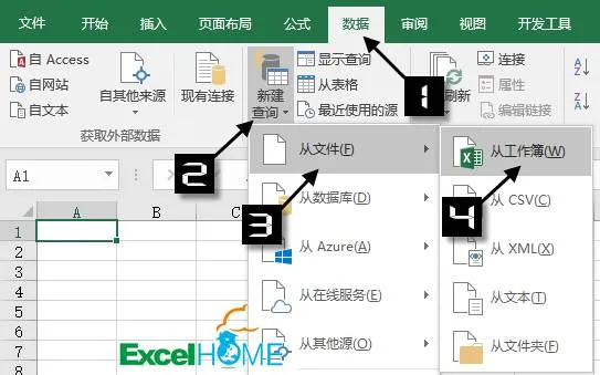 新建一个汇总工作簿,依次单击【数据】→【新建查询】→【从文件】→【从工作簿】:
