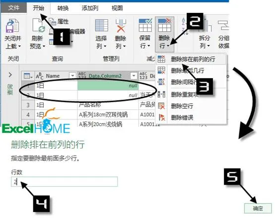 点击【删除行】→【删除排在前列的行】,然后指定行数2,【确定】。