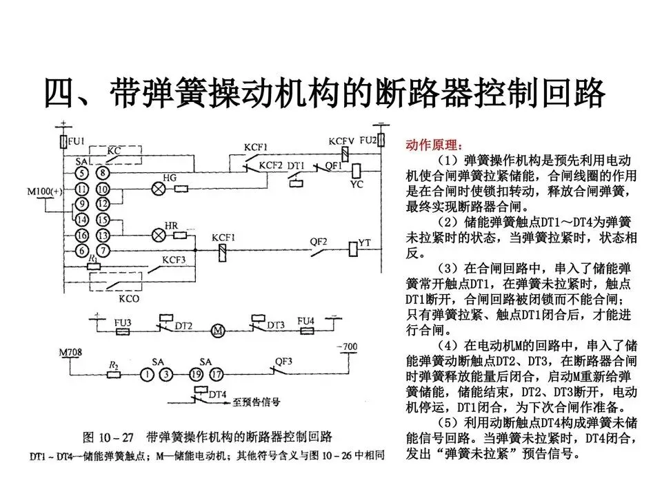 (4)在电动机M的回路中,串入了储能弹簧动断触点DT2、DT3,在断路器合闸时弹簧释放能量后闭合,启动M重新给弹簧储能,储能结束,DT2、DT3断开,电动机停运,DT1闭合,为下次合闸作准备。(5)利用动断触点DT4构成弹簧未储能信号回路。当弹簧未拉紧时,DT4闭合,发出“弹簧未拉紧”预告信号。