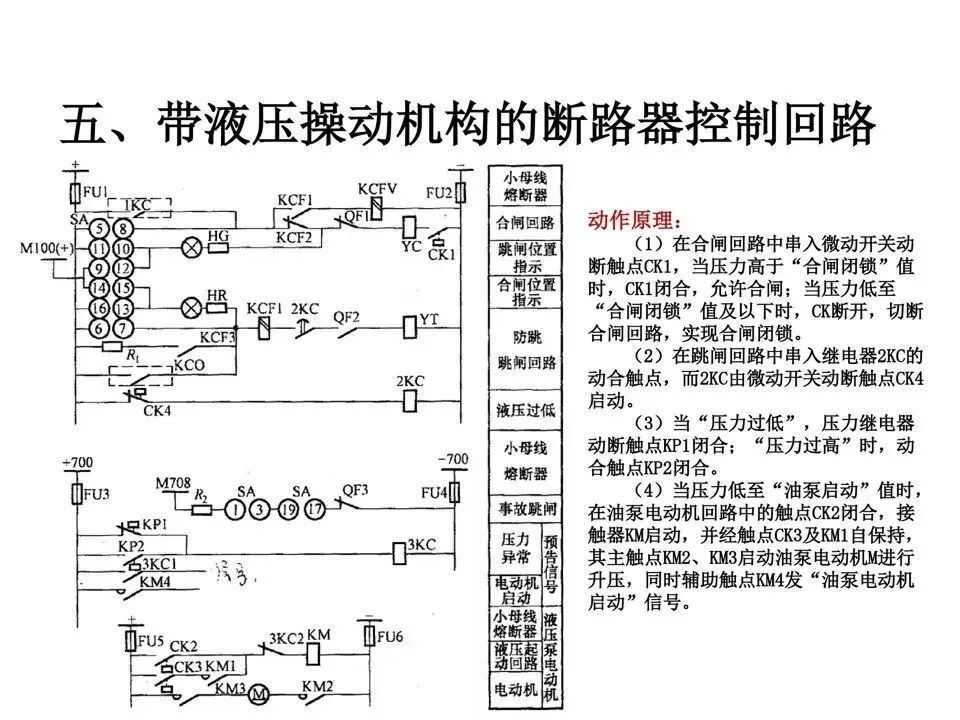 (1)在合闸回路中串入微动开关动断触点CK1,当压力高于“合闸闭锁”值时,CK1闭合,允许合闸;当压力低至“合闸闭锁”值及以下时,CK断开,切断合闸回路,实现合闸闭锁。(2)在跳闸回路中串入继电器2KC的动合触点,而2KC由微动开关动断触点CK4启动。