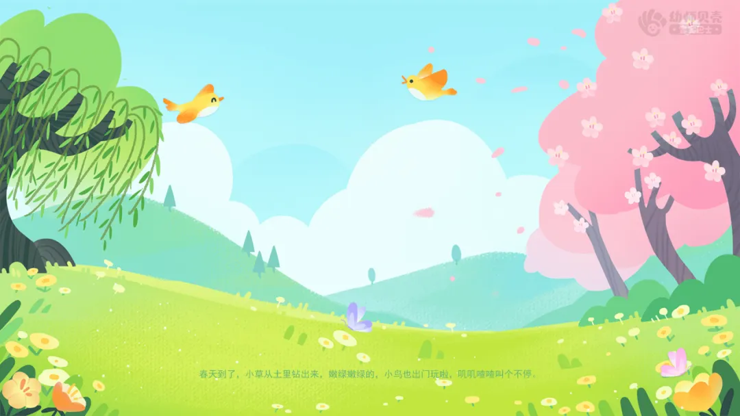 ——春天到了,小草从土里钻出来,嫩绿嫩绿的,小鸟也出门玩啦,叽叽喳喳叫个不停。