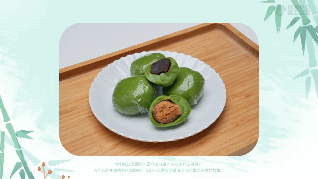 清明节前后,园所可为幼儿准备青团,师幼共同品尝。