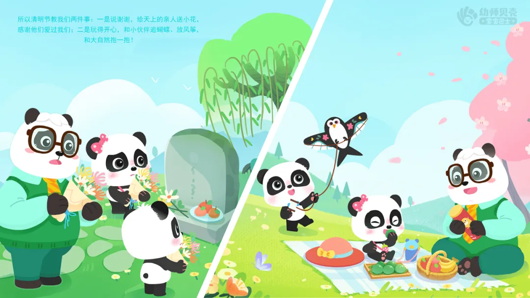 小结:所以清明节教我们两件事:一是说谢谢,给天上的亲人送小花,感谢他们爱过我们;二是玩得开心,和小伙伴追蝴蝶、放风筝,和大自然抱一抱!
