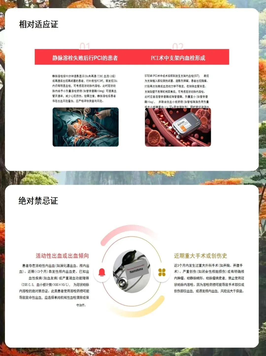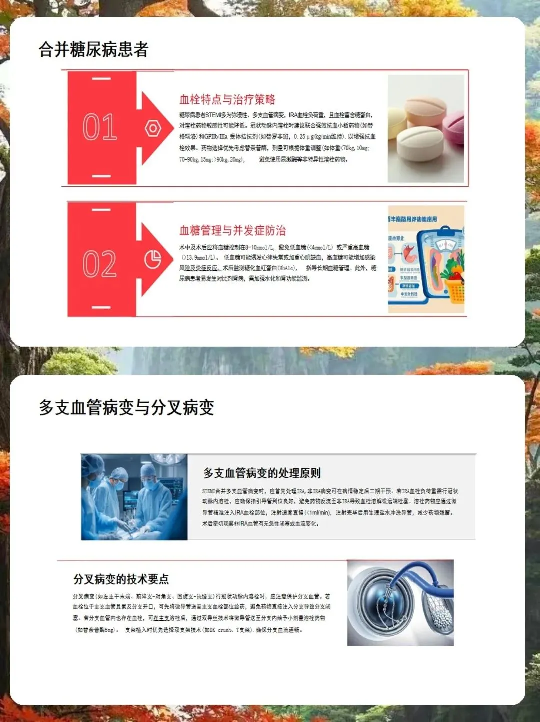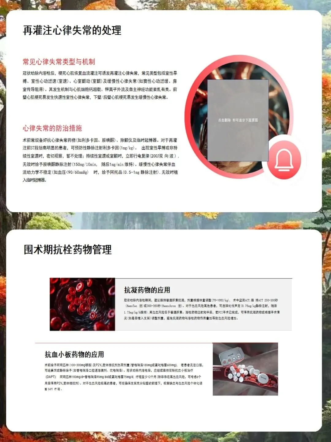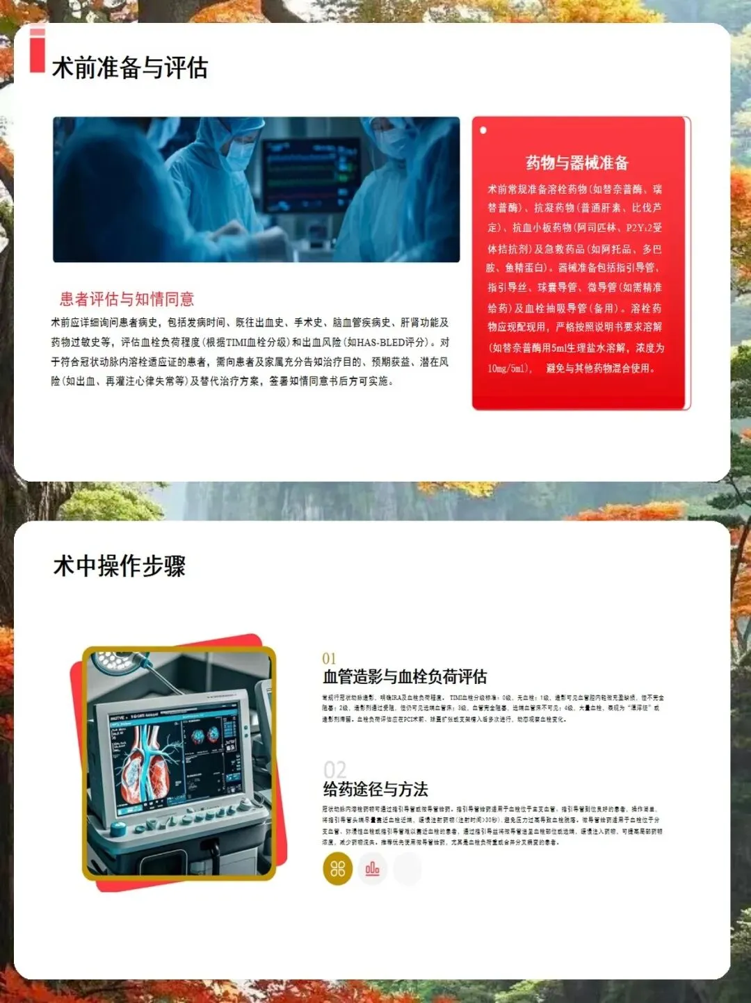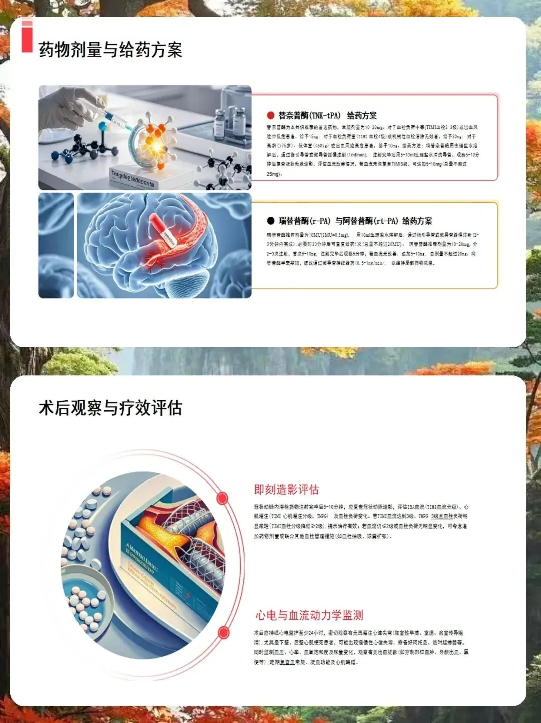 操作流程上,我总结了三个要点。第一,给药途径。如果血栓在主支且导管到位好,可以用指引导管;但如果血栓在分支、弥漫或导管难以靠近,强烈建议使用微导管,这样能精准给药,减少药物流失。第二,注射速度。一定要慢,每分钟1毫升左右,注射时间超过30秒,避免压力过大导致血栓脱落。第三,给药时机。可以在球囊扩张后、支架植入前,或者支架植入后发现血栓残留时进行。术后管理同样重要。我们要严密监测出血并发症,特别是穿刺部位和消化道。如果出现轻微出血,局部压迫即可;但如果是严重出血,必须立即停药,并输注血制品。此外,还要警惕再灌注心律失常,前壁心梗易发室速室颤,下壁心梗易发缓慢心律失常,术前要备好除颤仪和阿托品。