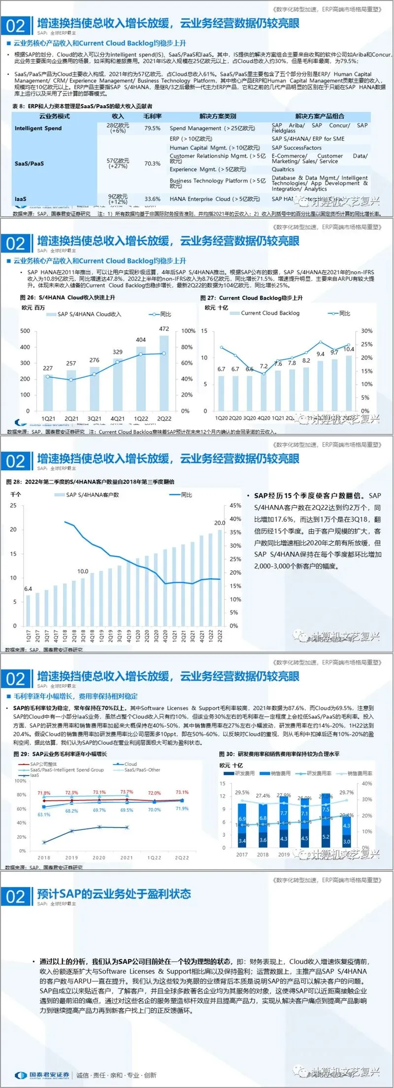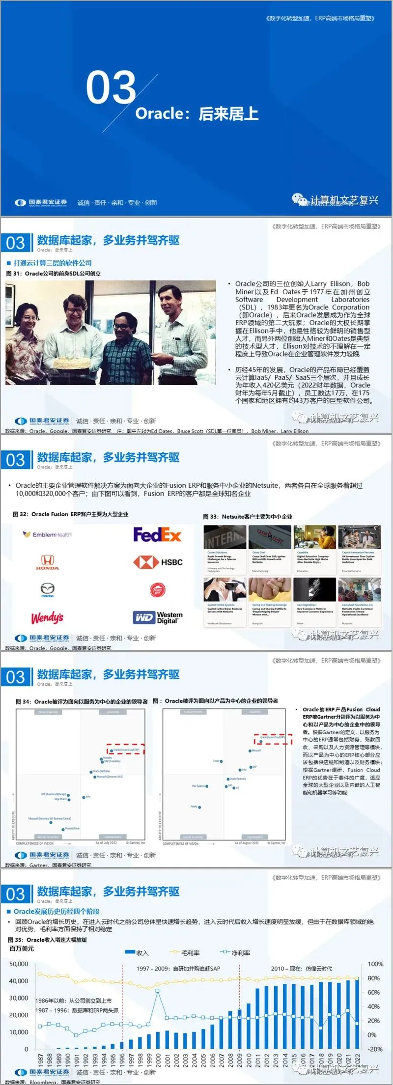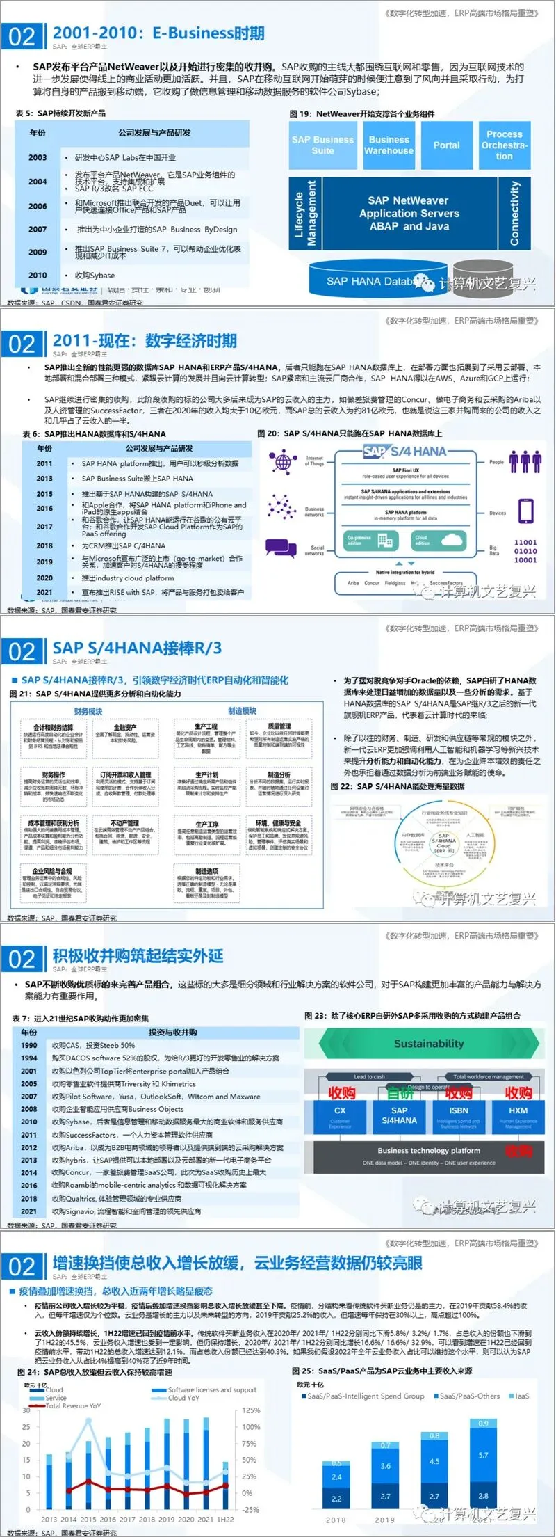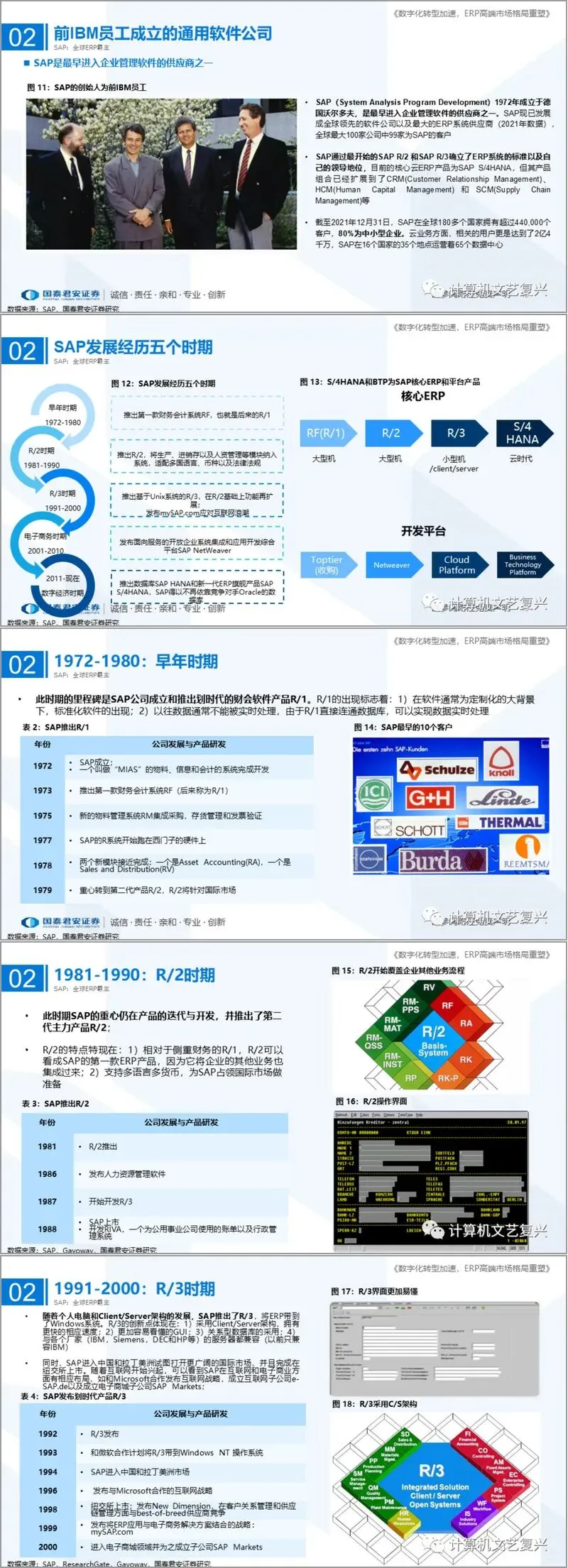 国际厂商中,SAP 作为全球 ERP 霸主,凭借 S/4HANA 核心产品确立领先地位。其发展历经五大阶段,从早期财务会计系统到云时代的S/4HANA,通过自研 HANA 数据库摆脱对 Oracle依赖,融入人工智能与机器学习技术,强化分析与自动化能力。SAP 通过密集收并购完善产品组合,云业务收入持续高增长,2021 年 S/4HANA Cloud 收入同比增速达 47.8%,客户数突破 2 万个。Oracle则以数据库业务为根基,打通云计算 IaaS/PaaS/SaaS 三层架构,核心产品 Fusion Cloud ERP 凭借套件广度与内嵌智能功能,成为全球大型企业的重要选择,其通过收购 NetSuite 补齐中小企业市场短板,云 ERP 收入保持快速增长。