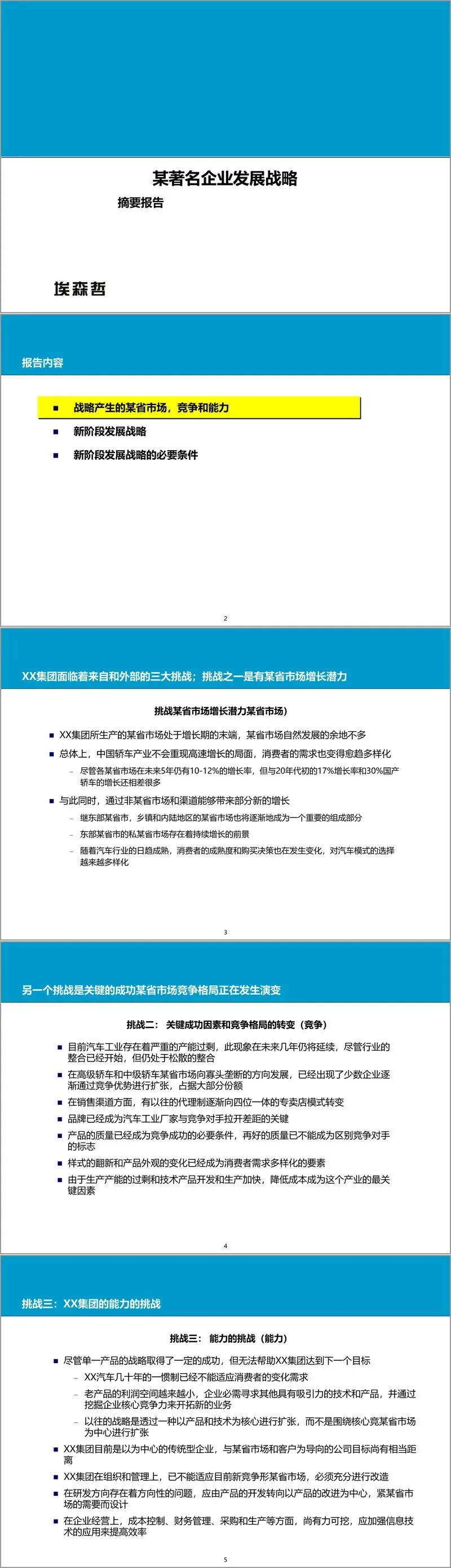 在汽车行业增速放缓、竞争加剧与消费需求升级的多重背景下,企业发展战略的迭代升级成为突破增长瓶颈的关键。这份聚焦某著名企业发展战略的摘要报告,以市场、竞争、能力三维分析为核心,系统梳理了企业面临的内外部挑战,构建了新阶段战略框架与落地路径,为理解汽车行业转型逻辑与企业战略抉择提供了深度参考。