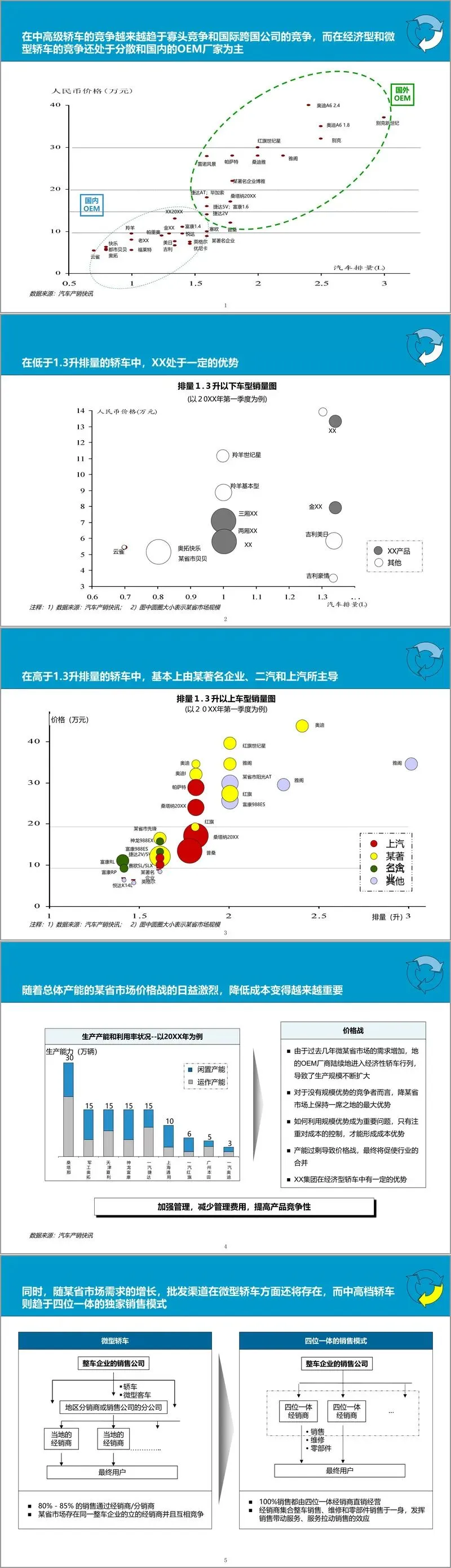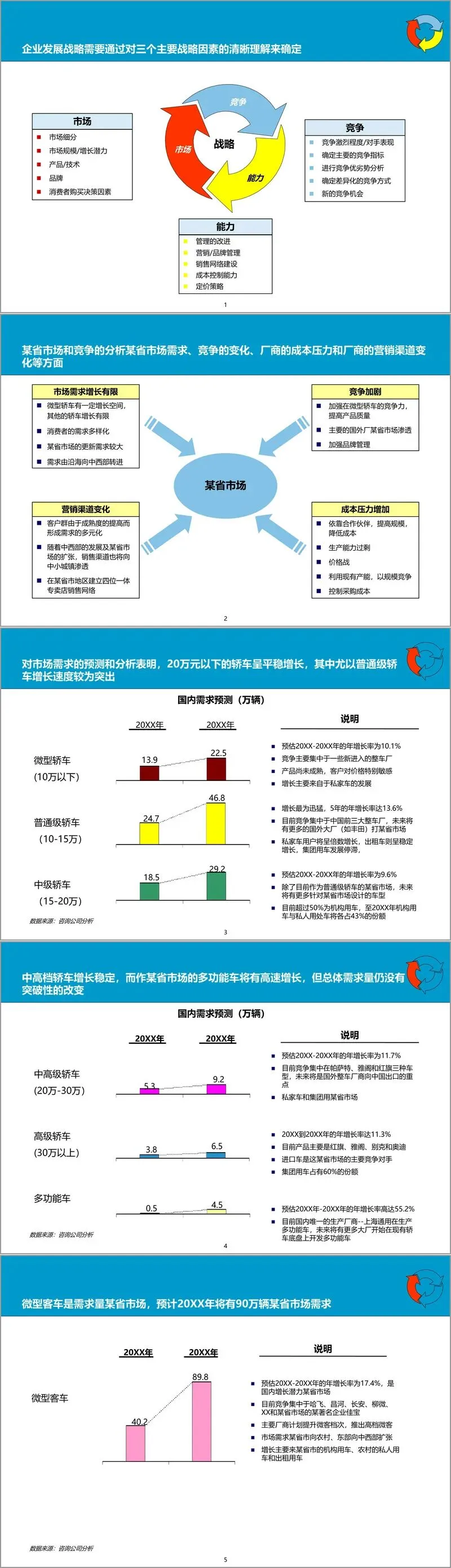 报告开篇明确了企业面临的三大核心挑战。从市场维度看,中国轿车产业告别高速增长,未来五年整体增长率维持在 10%-12%,远低于此前峰值,而消费者需求日趋多样化,市场重心逐渐向乡镇与内陆地区延伸,东部省市私人购车市场成为核心增长极。竞争层面,行业产能过剩问题持续,高端市场向寡头垄断演进,品牌、成本控制与产品迭代速度成为核心竞争要素,销售渠道从代理制向四位一体专卖店模式转型。企业自身能力方面,单一产品战略难以支撑持续增长,老产品利润空间收窄,组织管理、研发导向、成本控制等环节存在明显短板,与市场和客户导向的现代化企业目标存在差距。