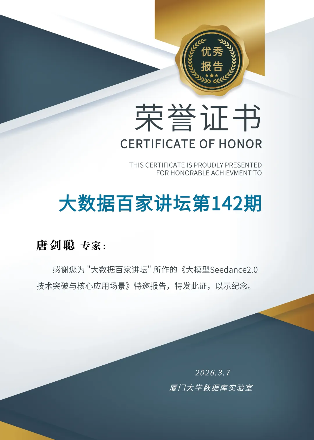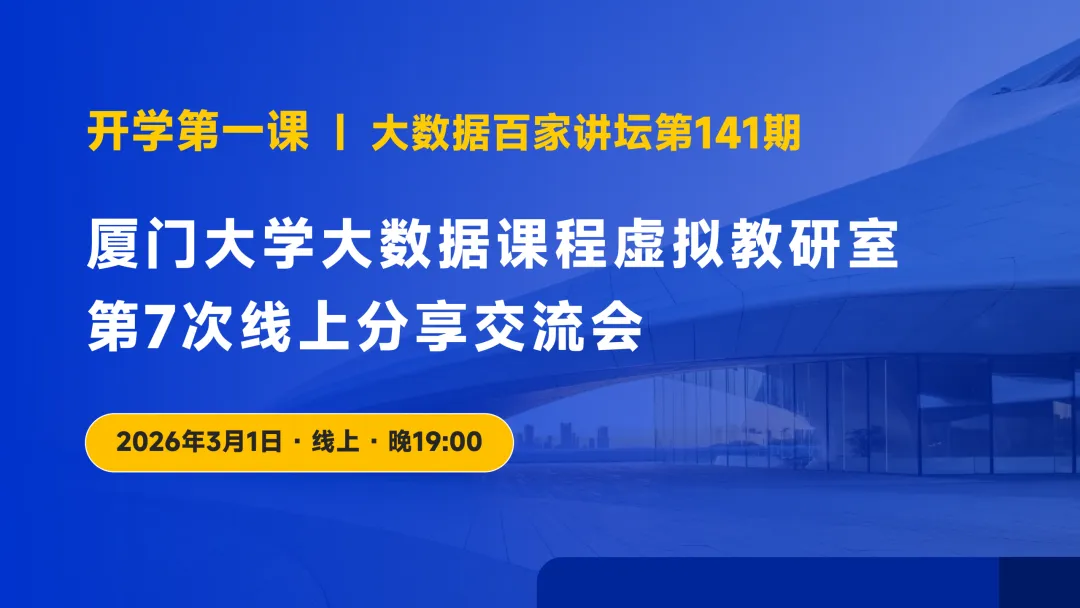大数据百家讲坛由厦门大学数据库实验室在2020年3月份发起,是厦门大学数据库实验室“高校大数据公共服务平台”的重点子工程。大数据百家讲坛目标规划是举办100场讲座,分别请不同大数据专家分享,包括但于政府领导、企业管理层或技术层以及高校教师。分享内容和主题涵盖大数据、人工智能、物联网、云计算、智慧城市和区块链等前沿最新技术及其产业化应用。