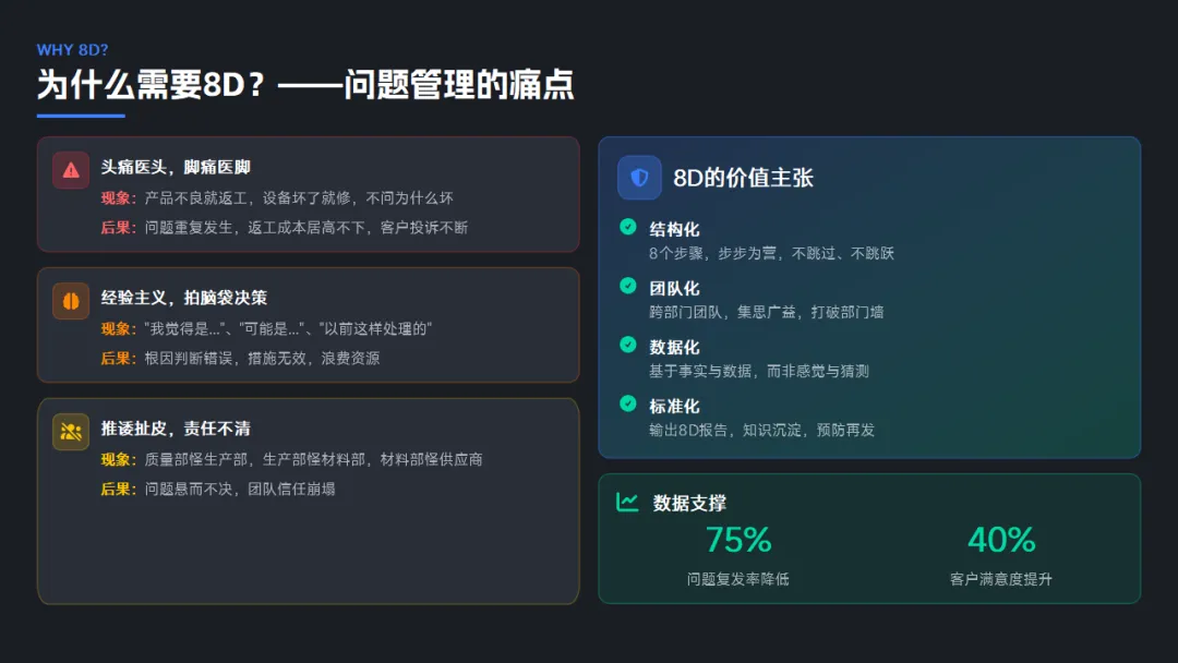 当问题发生时,质量部怪生产部,生产部怪材料部,材料部怪供应商,供应商又怪设计部门。这种"踢皮球"现象的根源在于缺乏一个跨部门协作的平台,缺乏一个客观、结构化的分析框架。8D方法正是为了解决这些问题而诞生的。