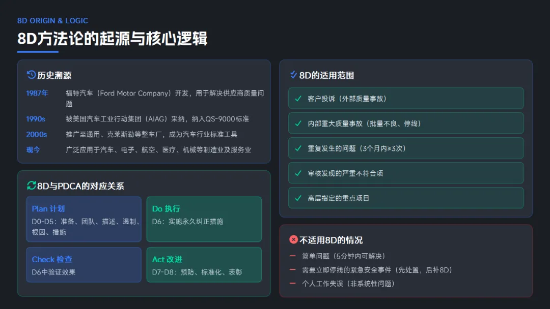 1987年,福特汽车公司(Ford Motor Company)为了应对供应商质量问题,开发了这一套方法,最初称为"团队导向的问题解决方法"(Team Oriented Problem Solving,TOPS)。当时福特面临日本汽车的激烈竞争,质量问题频发,传统的个人英雄主义式的问题解决方式已经无法满足需求,因此需要一种团队化、结构化的方法。