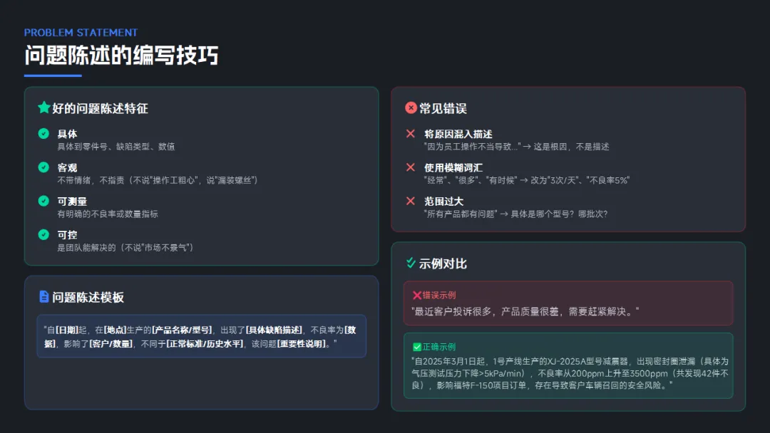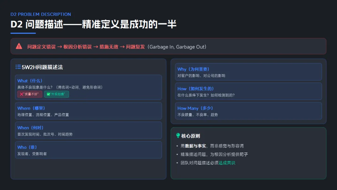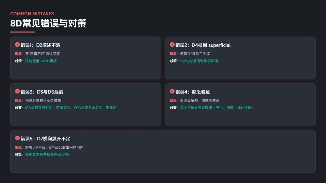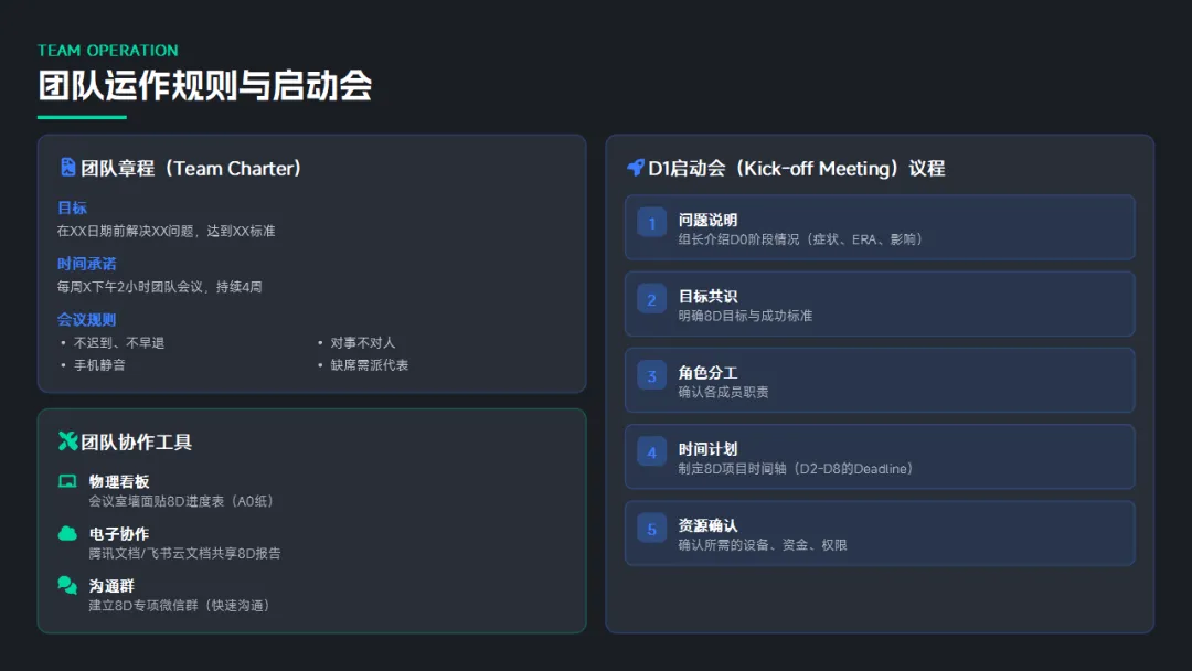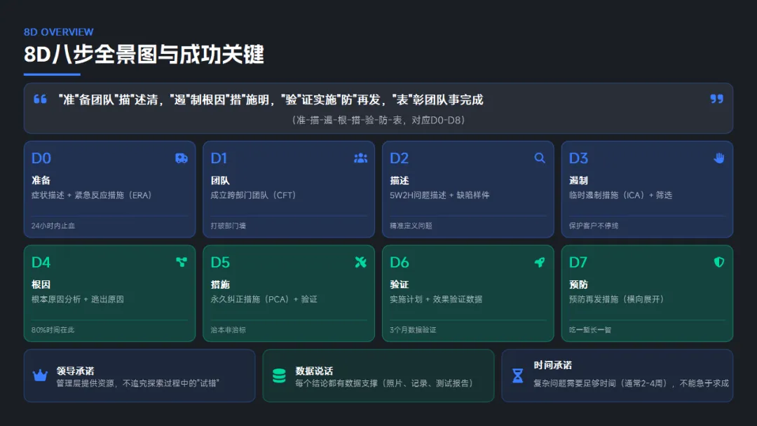 管理层必须提供必要的资源(人员、时间、预算),并且在探索过程中不追究"试错"的责任。如果团队成员害怕因为说错话而受到惩罚,8D就会变成一场政治表演而非真正的问题解决。