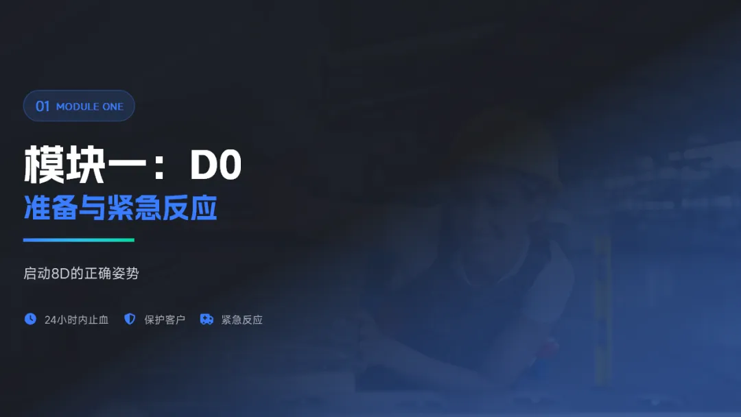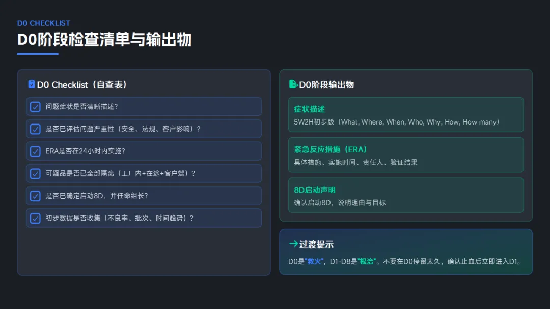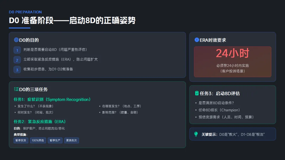 对应8D的D0到D5:D0是准备和症状识别,D1是组建团队,D2是问题描述,D3是临时遏制,D4是根本原因分析,D5是制定永久纠正措施。这六个D都是在做计划。
