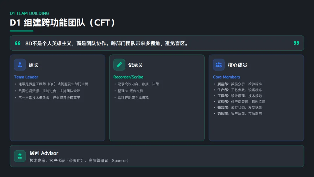 8D强调跨部门团队(Cross Functional Team,简称CFT)的协作。质量问题往往是系统性的,涉及设计、工艺、采购、生产、物流等多个环节。只有打破部门墙,集思广益,才能避免盲区。在8D团队中,没有"你们部门"和"我们部门"的区别,只有"我们团队"和"这个问题"。