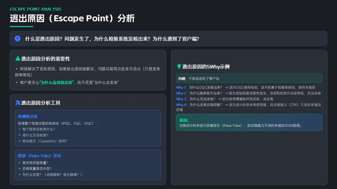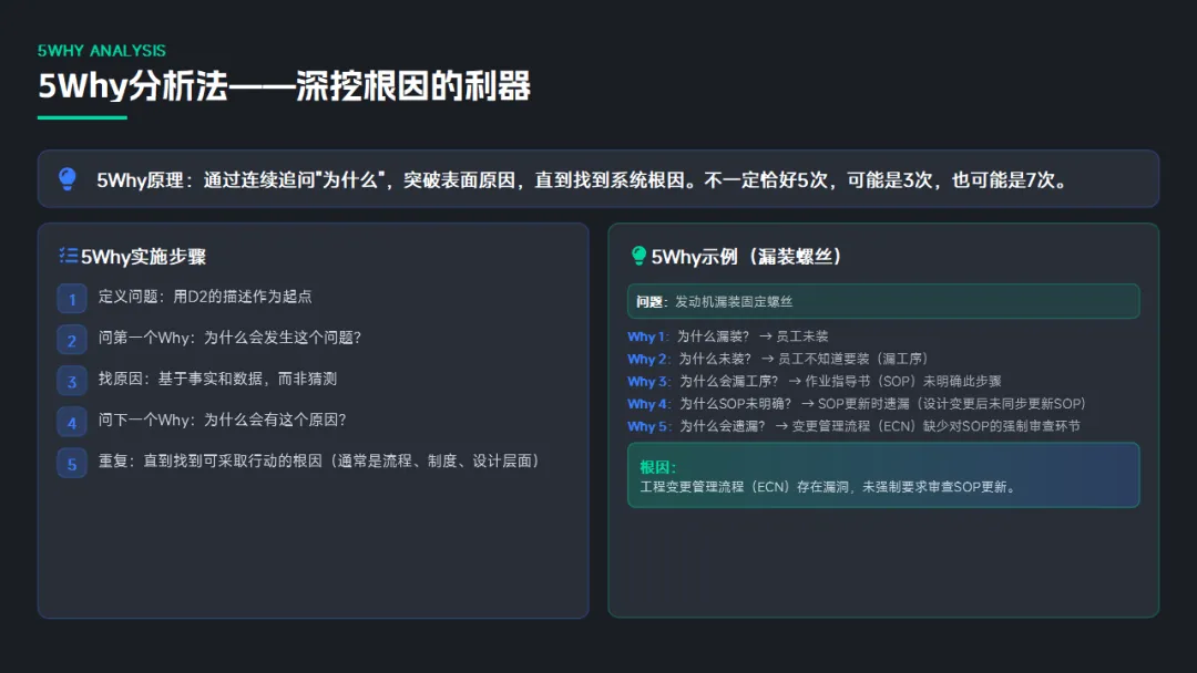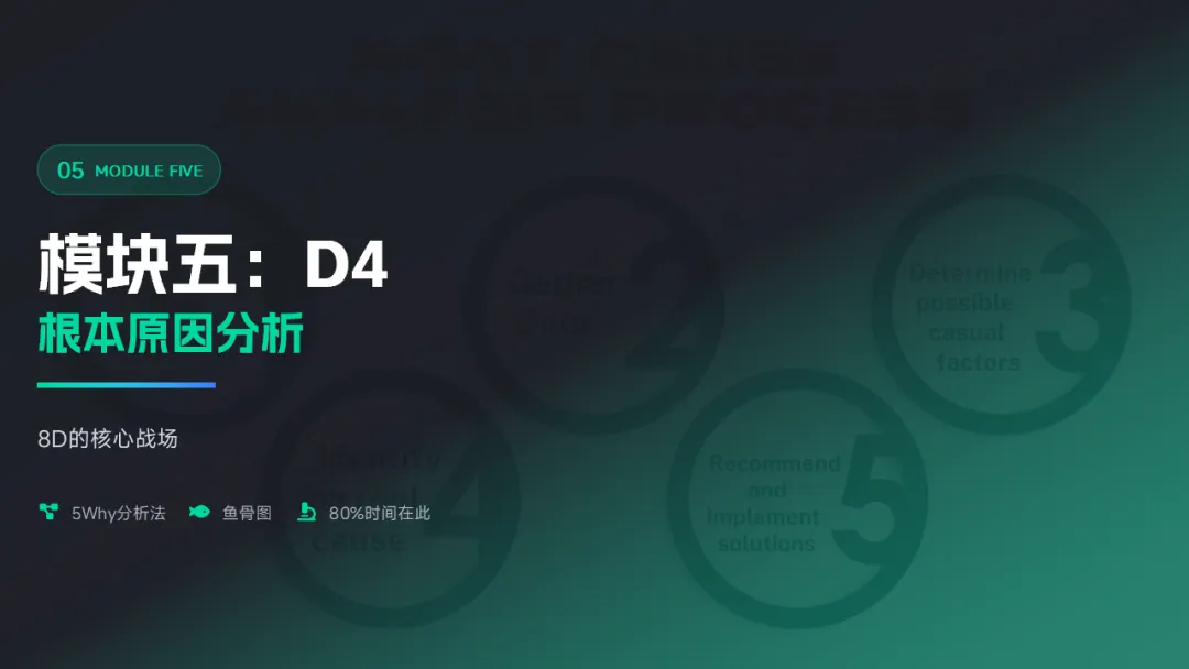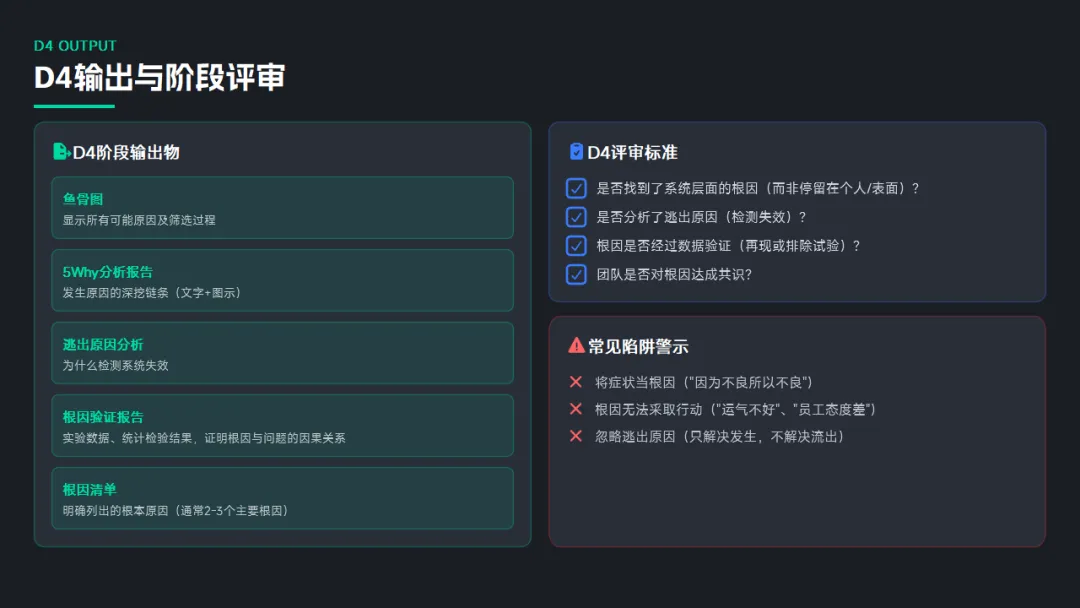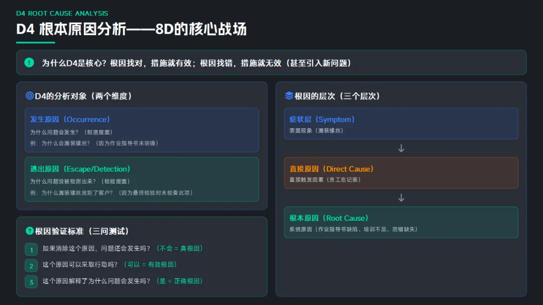 ——进行根本原因分析,包括发生原因和逃出原因。这一步是8D的核心,80%的时间应该花在这里。