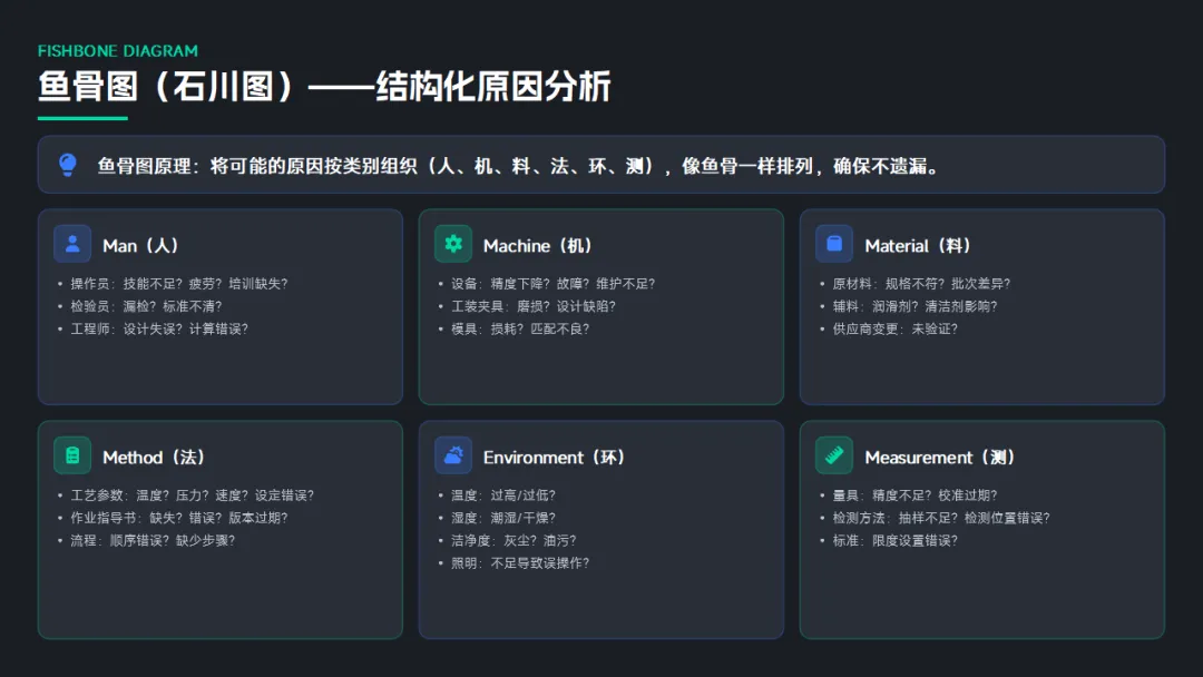 我听过太多这样的对话:"我觉得是温度的问题"、"可能是员工操作不当"、"以前我们都是这样处理的"。这种基于感觉而非数据的决策方式,根因判断错误率极高。一旦根因判断错误,后续的所有措施都是无效的,不仅浪费资源,还可能引入新的问题。有一个真实的案例,某汽车零件厂因为"觉得"是设备问题,花了50万更换了一台新设备,结果问题依然存在,最后发现其实是原材料批次差异导致的。这50万就是拍脑袋决策的代价。
