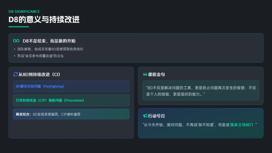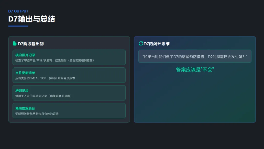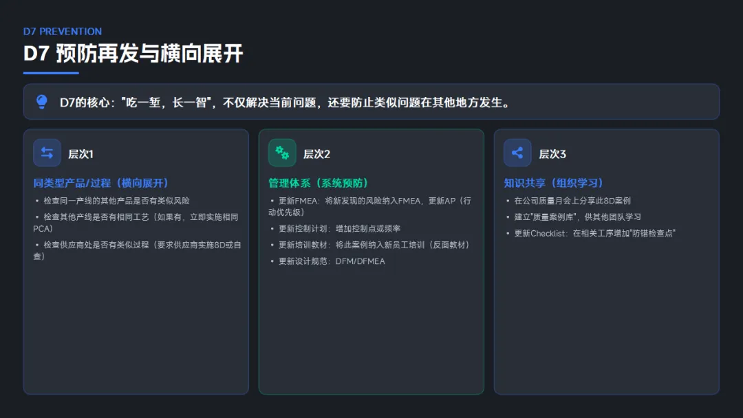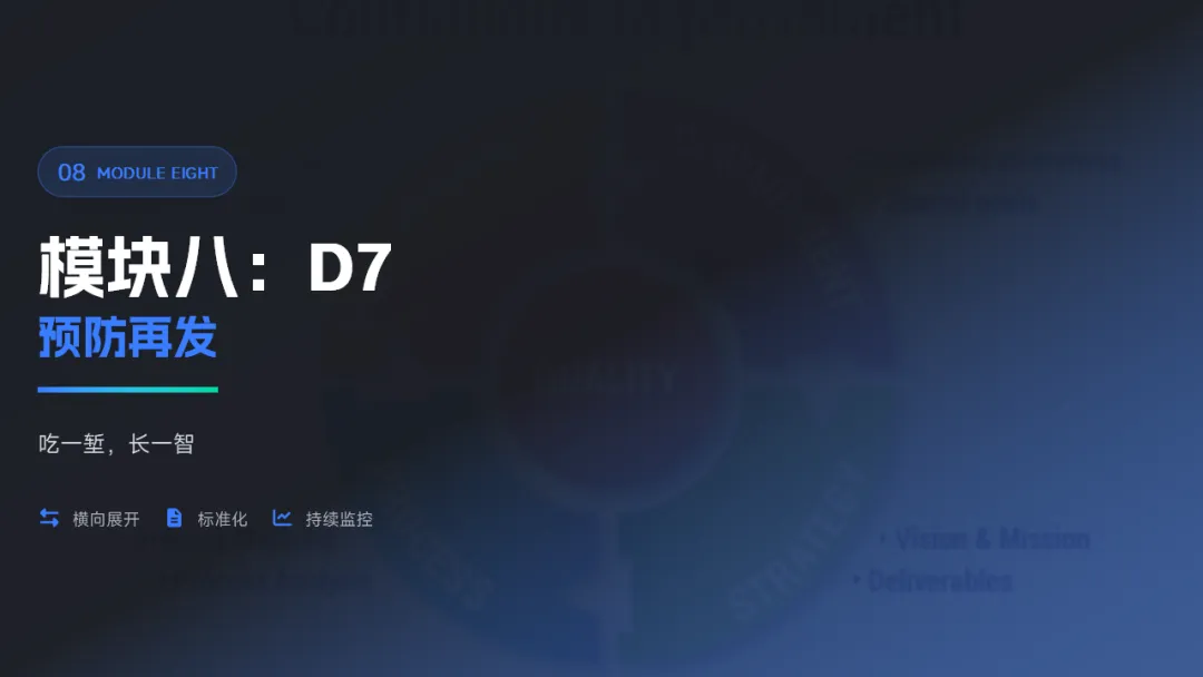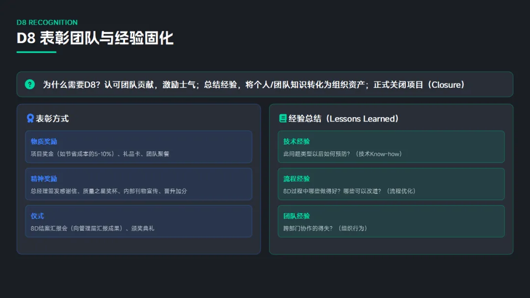 对应D7和D8:D7是预防再发,将措施标准化;D8是表彰团队,固化经验。
