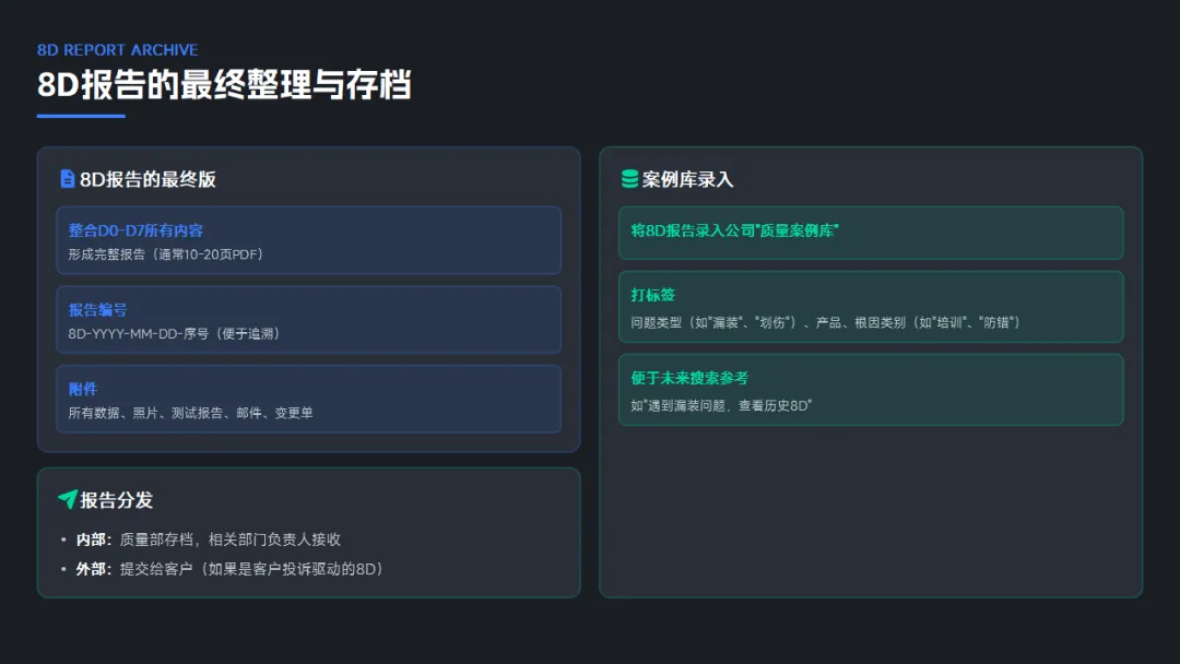 8D的输出是一份标准化的8D报告,这份报告不仅是问题解决的记录,更是组织的知识资产。通过8D报告,企业可以实现知识的沉淀和传承,防止同样的问题在新一代员工身上再次发生。
