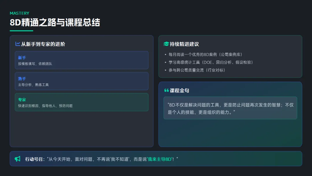 根据福特汽车公司的统计数据,实施8D方法后,企业的问题复发率平均降低了75%,客户满意度提升了40%。这不是神话,这是结构化管理带来的必然结果。