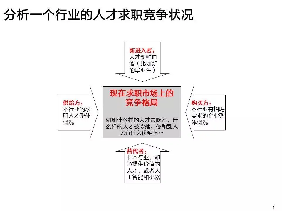 以上就是一个人才求职市场的竞争分析模型。接下来我们只用把这5个方面分别进行填空,最后就能得出一个完整的格局图景。