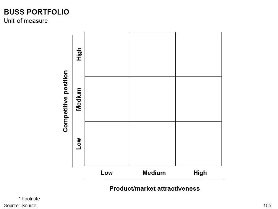 其中,横轴代表产品的市场吸引力(Product/market attractiveness),按照低、中、高的顺序共有三个坐标区域;