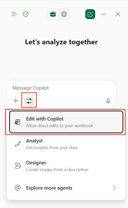 4.在 Copilot 聊天中,你可以选择“工具”菜单,然后选择「使用 Copilot 编辑」以允许直接编辑你的工作簿。