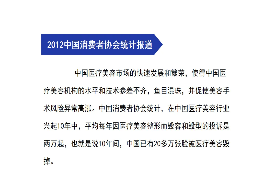 ✅ 医疗美容的现状:“变美”背后的风险有多大?PPT里说,中国整形美容产值3000个亿,医疗美容行业从业人员是2000万,医疗美容上游产品销售每年增长率为60%。中国已经成为全球第三整容大国,但医疗美容市场的快速发展和繁荣,使得中国医疗美容机构的水平和技术参差不齐,鱼目混珠,并促使美容手术风险异常高涨。中国消费者协会统计,在中国医疗美容行业兴起10年中,平均每年因医疗美容整形而毁容和毁型的投诉是两万起,也就是说10年间,中国已有20多万张脸被医疗美容毁掉。