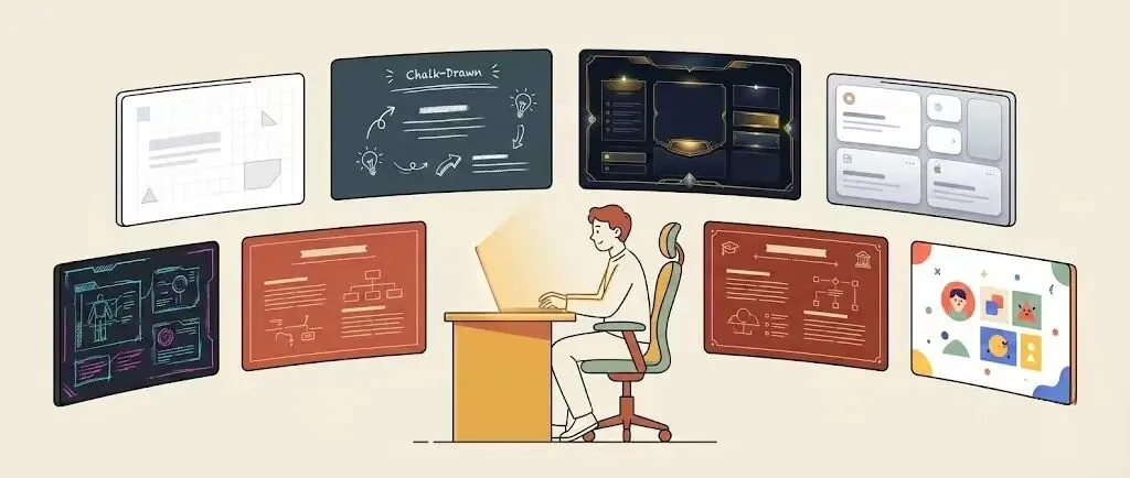 我花了一段时间,从各个平台和社区里搜集整理了13个亲测有效的AI生成PPT提示词——这篇先分享其中7个,涵盖从极简商务到游戏风,从手绘板书到苹果科技感,总有一款适合你。